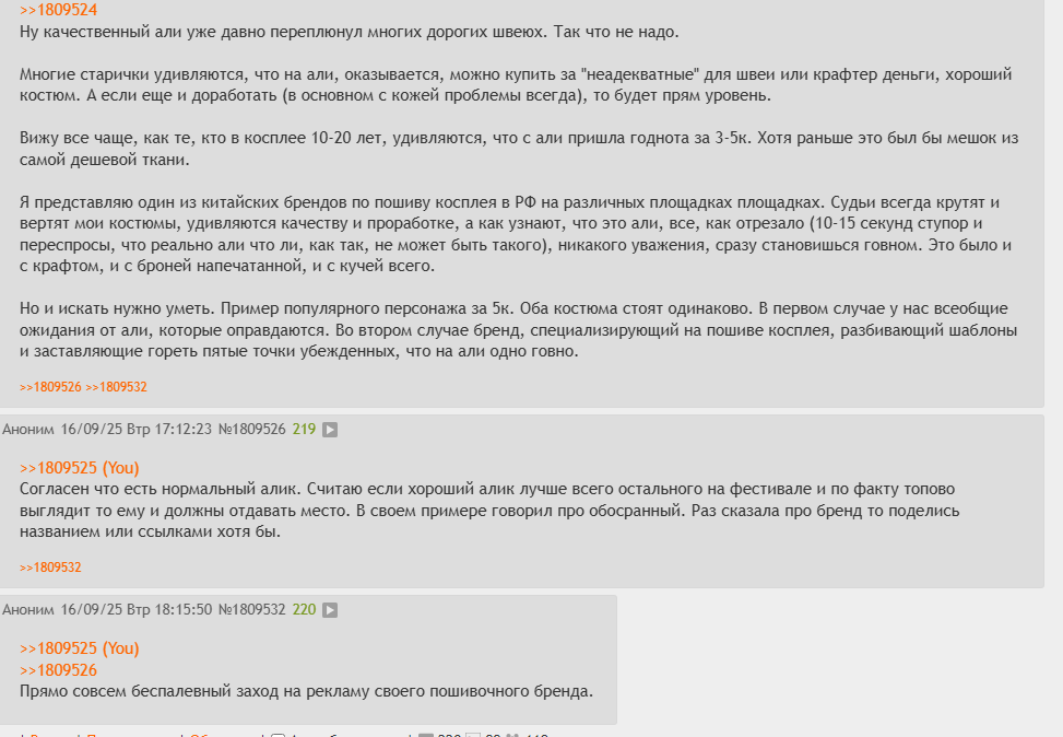 Я представляю один из китайских брендов по пошиву косплея в РФ на различных площадках площадках. Судьи всегда крутят и вертят мои костюмы, удивляются качеству и проработке, а как узнают, что это али, все, как отрезало (10-15 секунд ступор и переспросы, что реально али что ли, как так, не может быть такого), никакого уважения, сразу становишься говном. Это было и с крафтом, и с броней напечатанной, и с кучей всего.