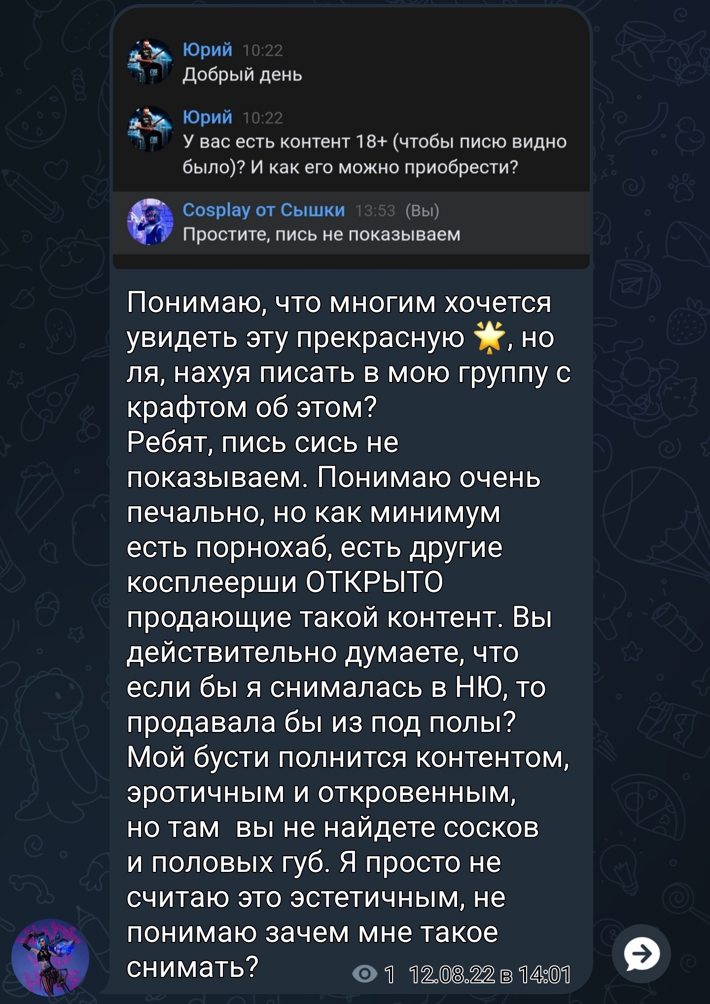 Блятб. Я не спрашиваю правда ли данный прейскурант. Я даже не спрашиваю, насколько он адекватен сабжу. Мне просто интересно: неужели такие деньги кто-то платит шлюхокосплеершам за фото/видео да хоть за ИРЛ гортанный минет. Да-да, мимонищук, офк. Может кто-нибудь доставить пруф, скажем, что кто-то, когда-то, скажем Энви или ещё какой соратнице по классу задонатил эквивалентные суммы за что либо?