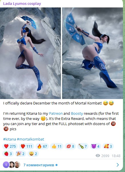 Про подарочный сет на бусти и патреоне у нее написано в телеге. Не знаю что ты там сливал, но сейчас косплейшицы не брезгуют заниматься сутяжничество если видят сливы тут. Поэтому если с барского плеча кто то и кидает, то только на там самом сайте где у них руки не дотянуться. Да и вообще мне тоже странно ждать слива довольно свежего сета при том что его цена ниже уже некуда. Даже наверно меньше чем сбросится вскладчину в какой-нибудь закрытой ггруппе в телеге. Думаю можно и 300 руб кинуть за подписку на месяц и до того как придет сет пройтись по ее странице на бусти и пощипать в коллекцию отдельные нюдсы которые до сих пор еще не слиты.