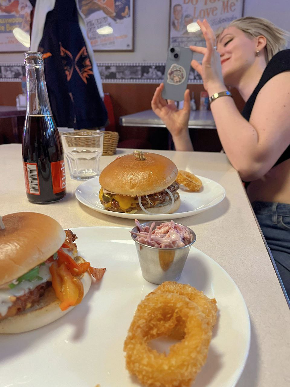 Бургер (двойная говяжья котлета, булка, сыр, соус) ≈ 750–900 ккал 2 луковых кольца ≈ 120–160 ккал Колслоу (маленькая чашка) ≈ 80–120 ккал Итого по тарелке: примерно 950–1150 ккал + Кола еще около 100 ккал. Да она уплетает больше чем некоторые мужики. Я понимаю, что такую большую попу нужно хорошо кормить, но потом пусть не удивляется, почему вместе с ней растет еще и пузо и руки опухли чуть ли не как у бодибилдера Ли Приста в лучшие годы