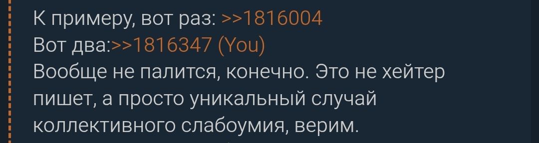 >>1816049 Не-а, потому что там есть контрагумент в виде небрежного отношения ко всем трём, а ты за Наргу и подружек любишь всираться, ну и судя по твоему молниеносному перекрытию - да, всё так и есть. Плюс вот это "поплыл", и построение фразы по типу: "ну, если то-то непонятно/не ясно/не видно - я уж не знаю.."