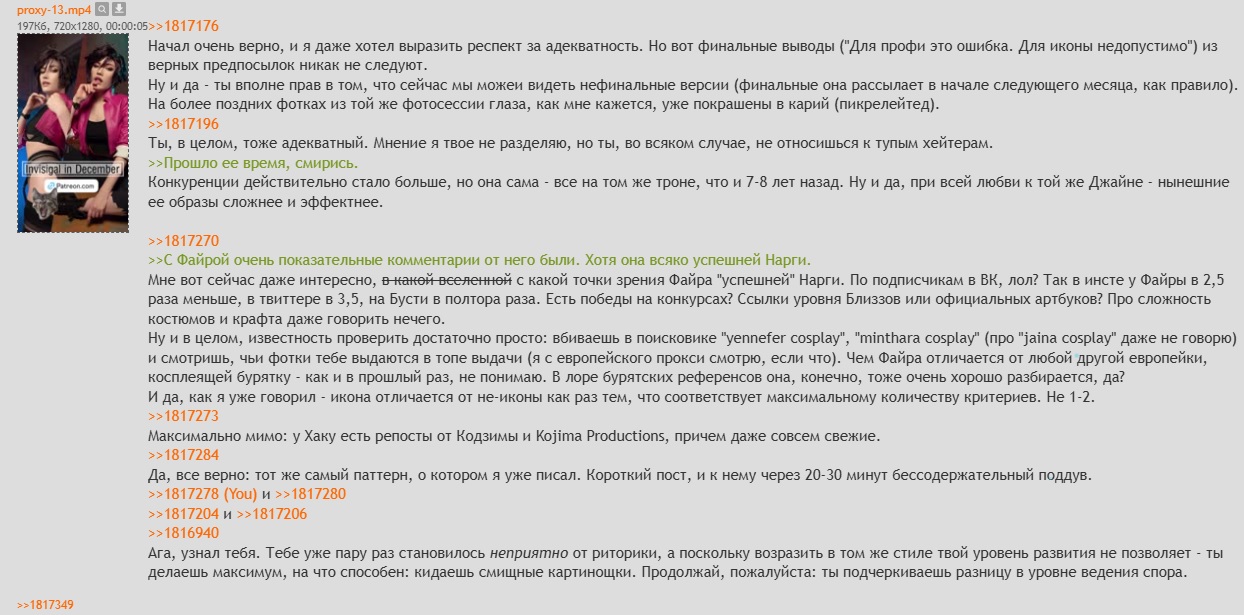 >>1818036 Тебе тяжело осознавать другое - что есть люди, которые косплеершами восхищаются (причем не только внешкой, а талантом и скиллами), а не дрочат на сисикписик. >>почему сначала глаза выложены голубые? Потому что сначала она выложила селфач и бэкстейдж с мармеладками? >>Пиздец, так скоро дойдем до восхищения нарезкой линолеума. Ого да ты знаток - тысяча чешуек, сделанных вручную - это "нарезка линолеума". Был тут другой анон, который Наргу тоже хейтил (и упирал на то, что Нарге идею подкинула Дзиро), но хотя бы в сложности крафта разбирался. >>приходится какие-то там чешуйки резать. Ога, вместо занавесочных закосов под бурятку "приходится" ёба-костюмы шить. Верю. >>1818040 >>он такойвау, дочь, это шедевр! Только не он и не я, а художник-автор референса, к примеру. Которому по определению виднее, как должна выглядеть какая-нибудь Минтара. >>вахлятку Интересный говорок. Как село называется? >>1818046 и >>1818049 Паттерн продолжает работать, спасибо. >>1818018 Когда будешь спать ложиться - не забудь под кровать заглянуть. Может, где-то там тоже таится "симп". >>1818057 Стандартно, да. Виноват тот, кто восхищается - а не тот, кто оскорбляет.