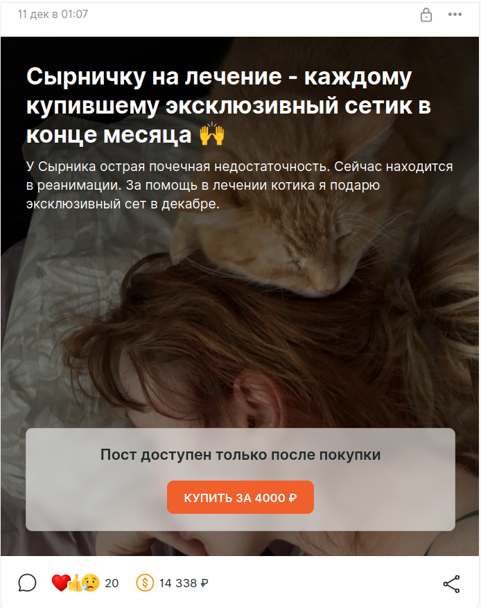 Еще более странно это стакается с её постом в начале месяца, где она эксклюзивный сет обещает, с условиями которые позже озвучит, а через 10 дней - хуяк вы слушали маяк, и у неё котик болеет, скиньте денег на лечение за сетик. При всём уважении - выглядит это как гнилой байт на жалость. Можно было б что-то по умнее придумать, типа сбор "на новый год", "на отдых", даже банально "на новое бельё/трусы", и то более солидно звучит, чем такое.