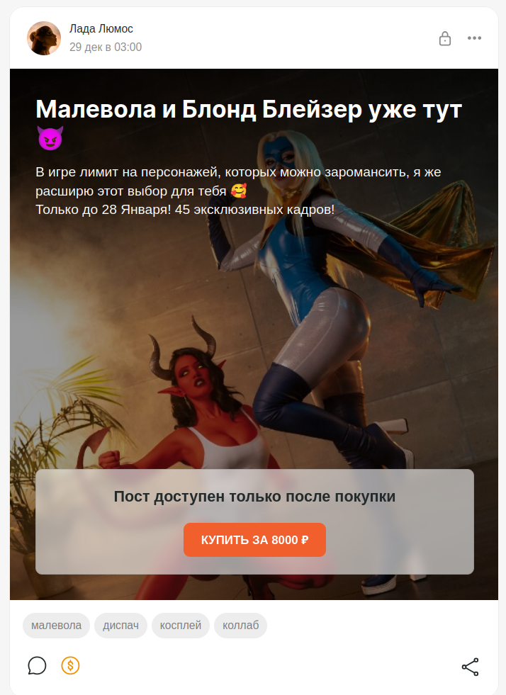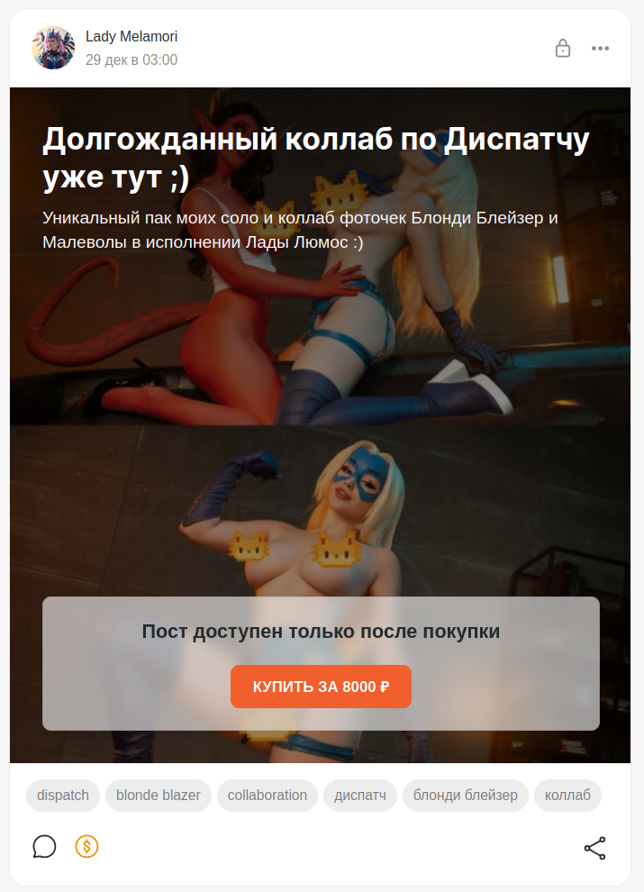 Свистните, если у кого есть часть коллаба со стороны Лады, и кого может заинтересовать обмен. Платить еще 8 косарей за заранее менее откровенные фото (которых даже меньше) еще и Люмосихе - нет никакого желания