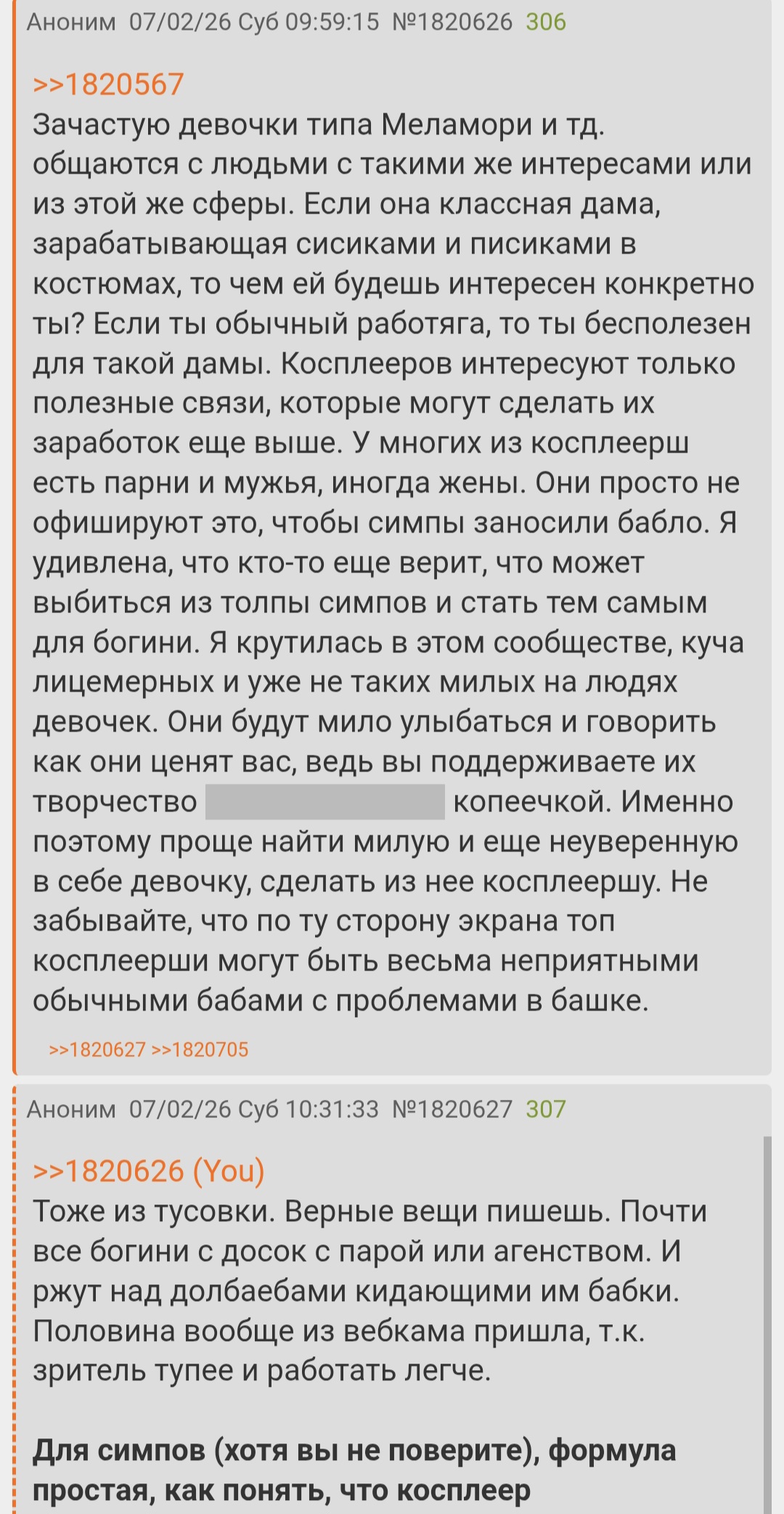 Для симпов (хотя вы не поверите), формула простая, как понять, что косплеер меркантильная шаболда или для себя это делает: 1. Как только начинается систематическая торговля жопой - это вам первый звоночек, что ей похую на косплей, а вы просто удобный скот по сбору бабла 2. Если торговли жопой нет или она нечастая, даже редкая, но начинаются истории слезливые про котов больных, долги за квартиру и прочие штуки, связанные с деньгами, с которыми только вы можете помочь, хоть "о помощи очень стыдно просить, но..." - это вам тоже охуенный звоночек, что вас держат за дурачков 3. Косплей на потоке по 3-4 образа в месяц спорный звонок, но явно говорит о том, что ни о какой любви к персонажу, пониманию лора и т.д. там вообще нет, все на похуе, что у Люмос, что у Меламори - один ебальник на всех персонажей, ноль стараний в мейке, т.к. симпы долбаебы и дрочат на бимбо-отфотошопленное в шлам лица и жопы.