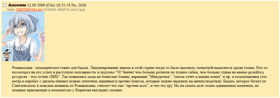 В 2012 году, когда мне было 14 лет, я заинтересовался всей этой аниме-тусовочкой, был фанатом Реанимедии, читал форумы, блоги и прочее. Можно сказать, я был пассивным участником реанимедиевской секты, а также секты блогеров времён ВК-пабликов и ютуба, обзорщиков Японии и обзорщиков аниме. Через несколько лет я добрался до двачей и начал читать всякое про Варелу (Пукера) и прочих основателей фандома в России. По прошествии стольких лет я до сих пор захожу почитать что-то про них, но уже куда реже. Можно сказать, все эти журналисты-блогеры были кумирами моего детства, которые втирали мне свои медиапродукты, а вы разбили мои розовые очки.
