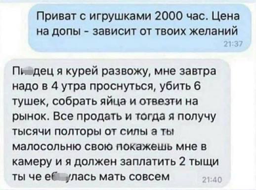 >>1821377 Я задала конкретный вопрос про то как она спалилась, что читает двачи. Попросила скрин конкретного коммента, раз она на постоянке это делает - наверное спалить не трудно. Но чел просто загасился и нахуй меня послал. И да, слежу за ней я давно, и такого не замечаю с хуй знает какого года. Я вот вижу что она скромная и без лишнего пафоса. И не пишет, как та же Файра у себя в группе что она известная или популярная. Самое смешное - вы тут рил ущемляетесь с какого-то симпа, который просто ей дифирамбы пишет. и нет, угараем типа, не катит совершенно. Я своё время на всяких дебилов не трачу. Значит и у вас тут всё строится на каких-то попытках оправдать свою неприязнь конкретно к Нарге. В жизни не поверю, что если бы тебе было похер - ты бы тут сидел и, как ты говоришь, угарал с симпа. Мне вот тут тупо мерзко уже, поэтому разок ещё отвечу и съебусь в свой загон.