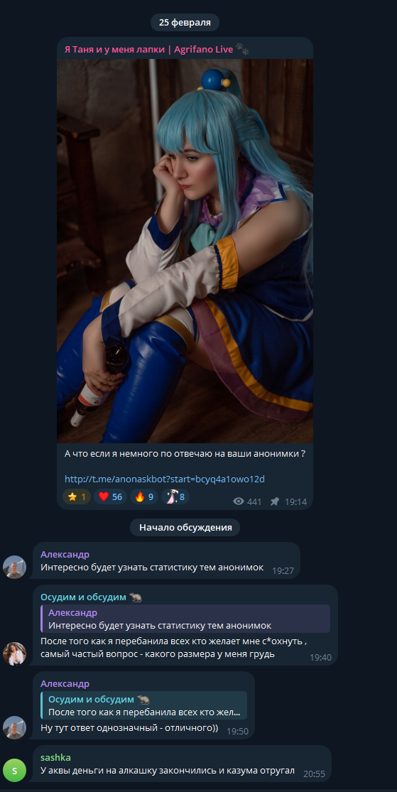 >>1822101 >Или она выдаёт свои фантазии за то, что хочет видеть. Надеется что получится выйти за рамки "эро косплея", где большинство фан база БЛ. Лично я вижу, что нихуя не выйдет у неё, в один момент просто уйдет с косплея, найдет обеспечуна и все.
