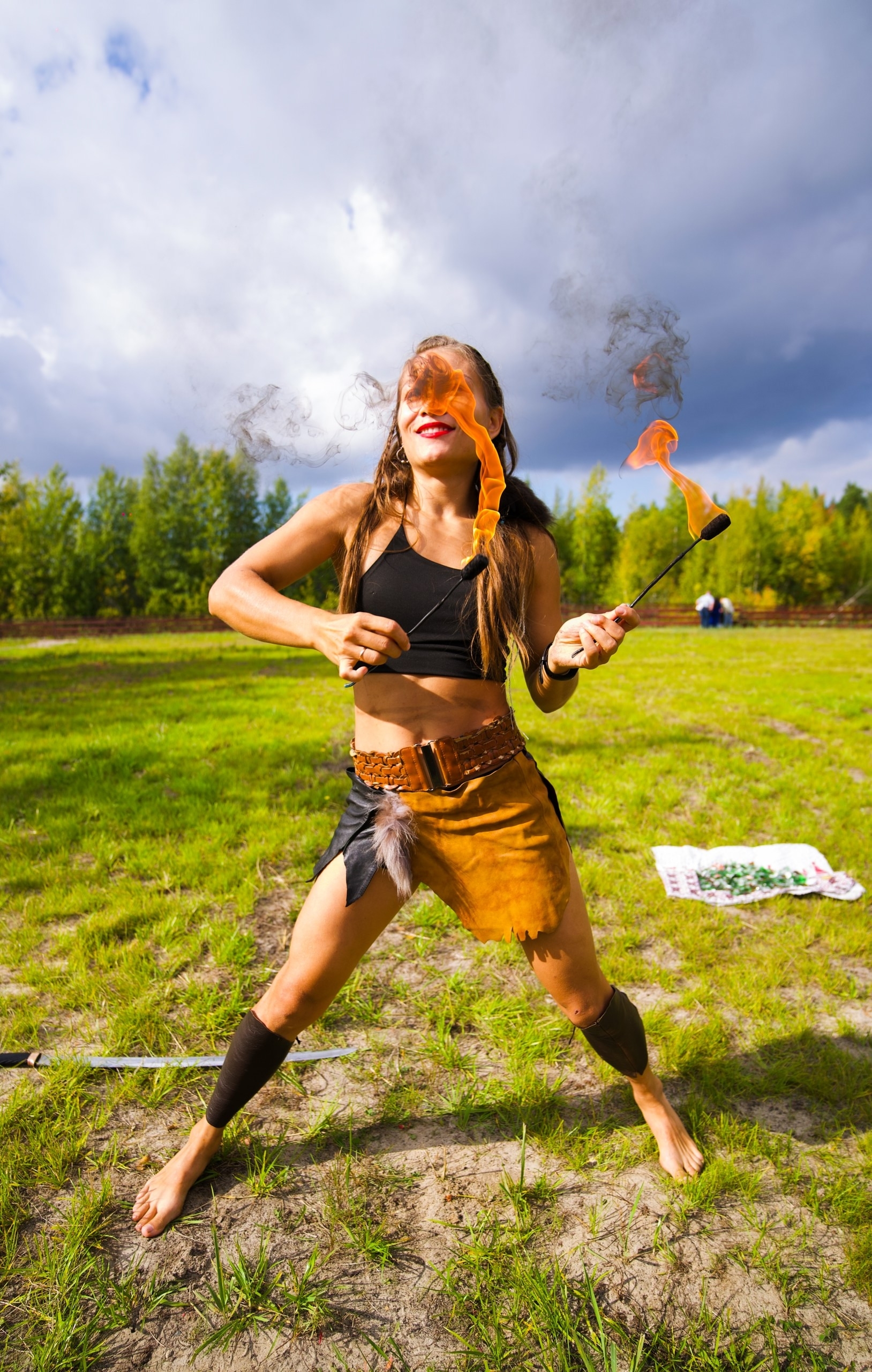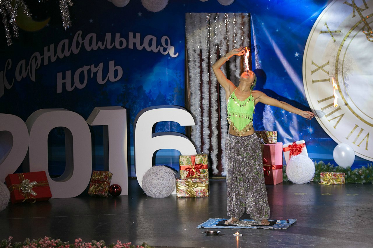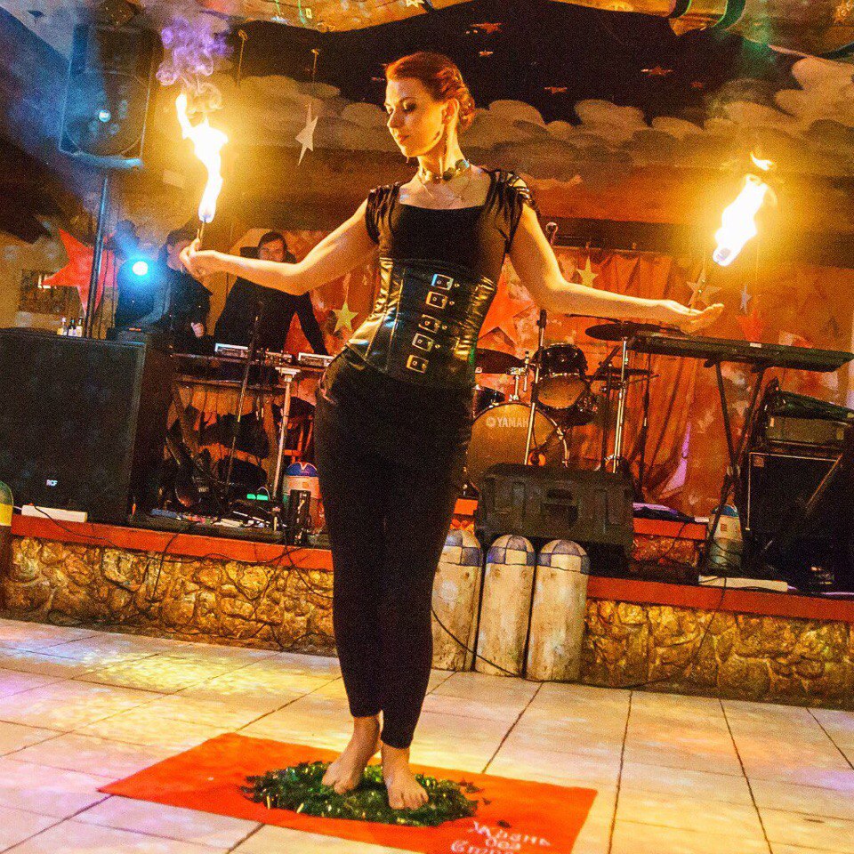 Особенно много заморочек с «перекрытием полена» (переднего и заднего), когда девочка, исполняя сие «в костюме Евы», работает по руке «сверху-снизу-сверху», переход на тело, вертикально между грудей, на «бок-ягодицу», ставит ногу на стул и, вводя сзади (не вздумай ставить ввод спереди – покалечишь девку!), тушит факел во влагалище. Дым там «коромыслом» и смотрится «убойно», но если ошибёшься с перекрытием тканью «поленьев», то сия амазонка получит эрозию шейки или ожог половых губ; потому я эту концовку не жалую, заканчивая её работу «топлес» на боку, а в купальнике или майке вообще ограничиваясь только руками. ... Когда факелом работает женщина, то сие смотрится «на порядок» круче, даже без особых наворотов. Хотя мужики на такой фигне и «кормятся стадами», но ставить программу советую женским группам...