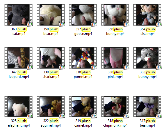 В жизни мне не хватает тактильных ощущений, но плюшечки это замечательно компенсируют. В этих роликах я только кончаю на них, а в целом очень нравится их обнимать, тереться и подолгу дрочить ими. Мишка во втором видео настолько нежный на ощупь, что я кончил ещё на второй "фазе" ролика. Когда-нибудь попробую купить полноразмерную игрушку из этого же материала - чувствовать такую мягкость всем телом, наверное, ещё приятнее.