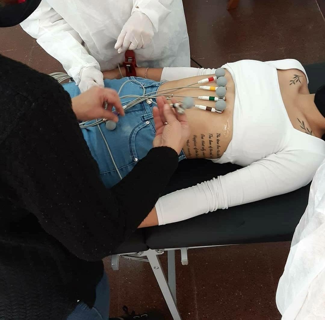 Мне жалко подопытную девочку, электроды наложены абы как и "врач" как будто специально хотел сделать больно, присоски ставил с размаху, плюс никакого понятия о гигиене и дезинфекции, после на ней остались жуткие следы (особенно на ногах), заживать это будет долго. Кстати, гель при ЭКГ применяют не только для улучшения контакта (с ним шумов почти 0 и присоски стоят мертво даже на волосатой груди мужчин), но и для снижения травматичности, именно поэтому в частных клиниках, где поток небольшой, по возможности используют его (но иногда женщины специально просят не мазать, как жена рассказывала, бывают те кто боятся аллергий и/или одежду потом запачкать, проще не объяснять а взять спрей)