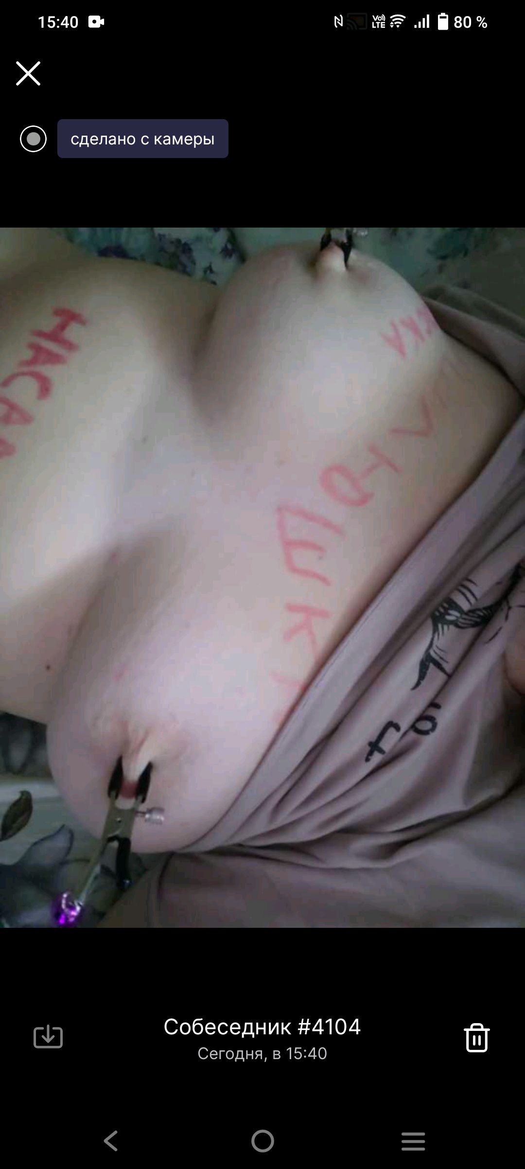 Пыталась написать на своем теле "Игрушка для Димы", но что получилось видите сами. Глупенькая шлюшка даже это не смогла сделать, но ведь мы с вами ценим её старание, да?)