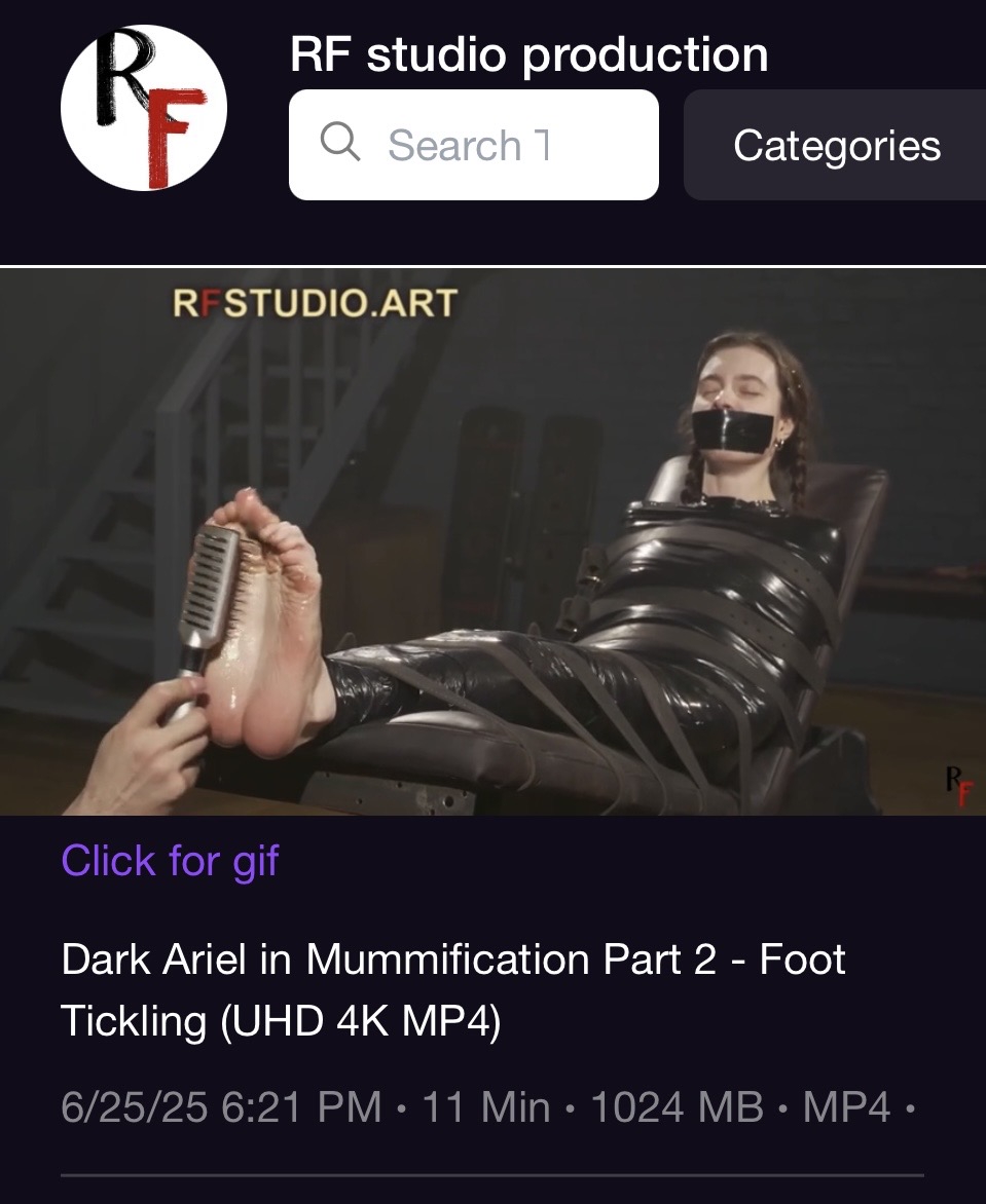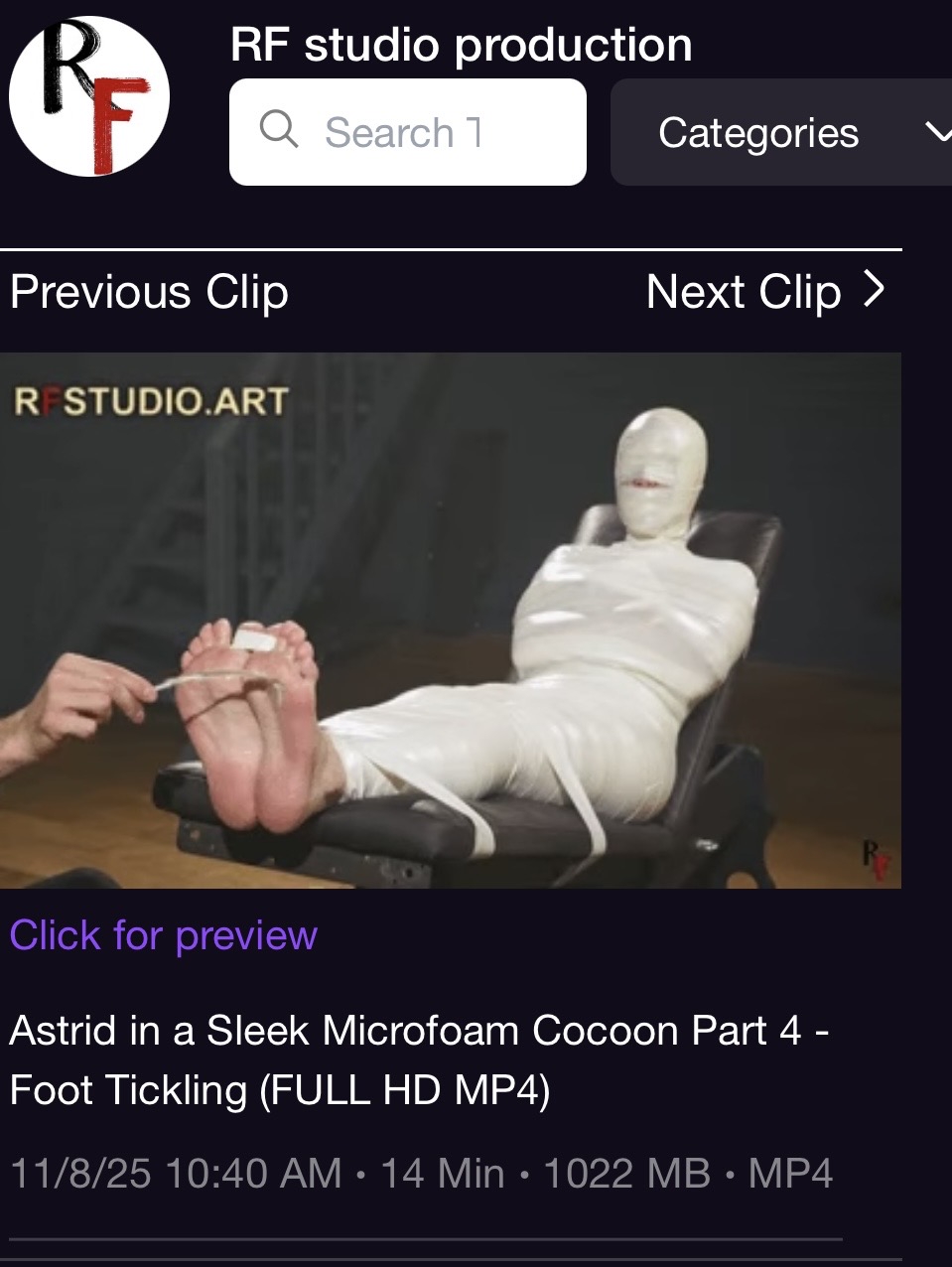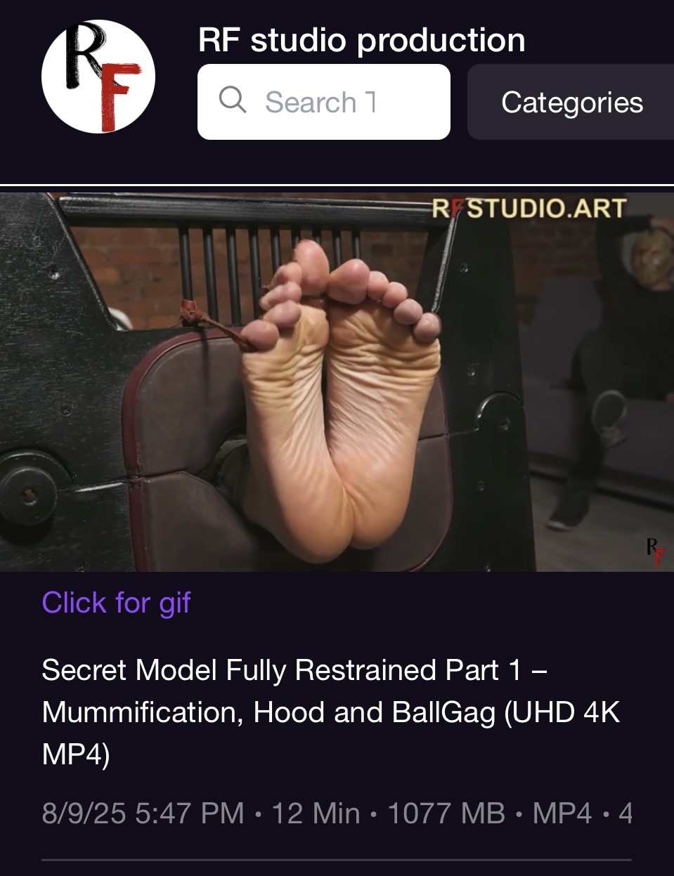 В этом первом ролике Секретная модель полностью мумифицирована и прикреплена к верстаку. Единственные открытые части ее тела - это босые ступни, от которых исходил легкий, естественный аромат, который я помню до сих пор. На ней капюшон из сенсорной кожи и сумка-мяч, она лежит в ожидании того, что произойдет дальше, полностью погруженная в происходящее.