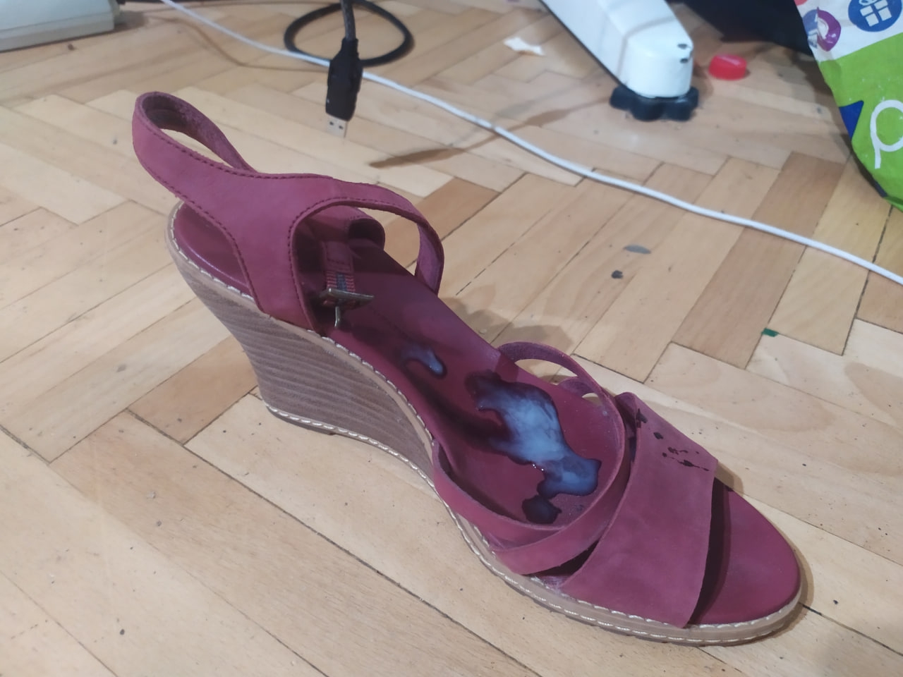Конечно же, я расстроился, но не терял надежды. Все еще не забыл главную цель, за которой я сюда пришёл. Я выскочил в коридор и достал телефон, да бы посветить фонариком на обувь мамки знакомого. Три пары кроссовок и черные пантолетки 38 размера) Счастья полные штаны, я выбрал свой фаворит, но, перед этим быстро перенюхал все три пары, просмотрев стельку. И ничего, нет ни запаха, ни следов ножки, как будто новые! Но расстраиваться не хотелось, ведь у меня в руках пантолетки со шпилькой, закрывающие лишь небольшую область выше пальчиков, где на стельке видны впечатавшиеся следы массивных, угловатых краем пальчиков ног. Забежав в туалет, я закрылся и мигом стал внюхиваться в её деловую обувь, в одну пантолеточку. Начал целовать между пальчиков, сами пальчики, пяточку и стопу. Я облизывал полностью и очень по долгу, ощущая совсем чуть-чуть соленоватый привкус пота её ступней. В конце концов я обильно наплевал на нее, размазав всё по стельке. За всё это время мой член нехило набух. Вены вот-вот лопнут, головка пульсирует под стуки сумасшедшего сердца. В этот момент один из товарищей стучится, ему кажется нужно было отлить. Я попросил его подождать еще 5 минут, адреналин поднялся выше крыши! Я начал агрессивно входить в эту небольшую дырочку, окруженную кожанными стеночками пантолетку, вперед, назад, влево вправо. Насадив её на член, моя головка целиком раскрылась, и вот на отпечатки тёмных следов от пальчиков потекла ручейком смазка. Я аккуратно вытащил член, и накапал ей на такой же темный отпечаток её пяточки. Какой чудесный момент, я был ужасно близок к тому чтобы кончить. Член просил поскорее пометить своим семенем чудесную, деловую обувь прекрасной, улыбчивой хозяйки, я решил поскорее все это дело сфоткать, пока не кончил, да бы насладиться еще не до конца законченной работой. Но, стало поздно. Хозяйка обуви вернулась, как по инстинкту, интуиции. Почувствовала, что её вещь в опасности, что её помечает кто-то иной, кроме её мужа. Натянув джинсы я припрятал пантолетки себе под свитер, и прислушался, встав у двери. Решил подождать, пока они зайдут в комнату да бы переодеться, а я тем временем быстро закину пантолетки на место. Вот, слышу как свет выключился, смываю унитаз, для правдоподобности, выбегаю и плюю на одну пантолеточку из-за нереального возбуждения и от чувств несправедливости, рассерженности, недостаточности! Ставлю их аккуратно в шкафчик и иду на кухню, выпить воды. В это время на кухню заходит она, та самая хозяйка тех пантолеток, которые были практически помечены мной, я практически завладел ими, я бы мог быть уверенным что когда нибудь она наденет их на босую ножку и поймет, что стелька слегка прилипает к стопе, к пяточкам, к пальчикам. Начнет разбираться, рассматривать, нюхать эту пантолетку, вымывать брезгливо свою аккуратную ножку 38 размера с угловатыми грязными пальчиками... Как же могло быть здорово... Так вот! как на зло, опустив глаза вниз, да бы насладиться её ножками вновь, я увидел то что она была без носочков. Не сомневаясь в безумной красоте ее волшебных пальчиков с бардовым педикюром, она оставляла горячий, видимый след на чистом блестящем полу. Как я понял, её ножке было слишком тепло, даже жарко, что та непременно успела сильнейшим образом вспотеть, до такой степени что оставляла след за собой, как после горячего душа. Мой член 
