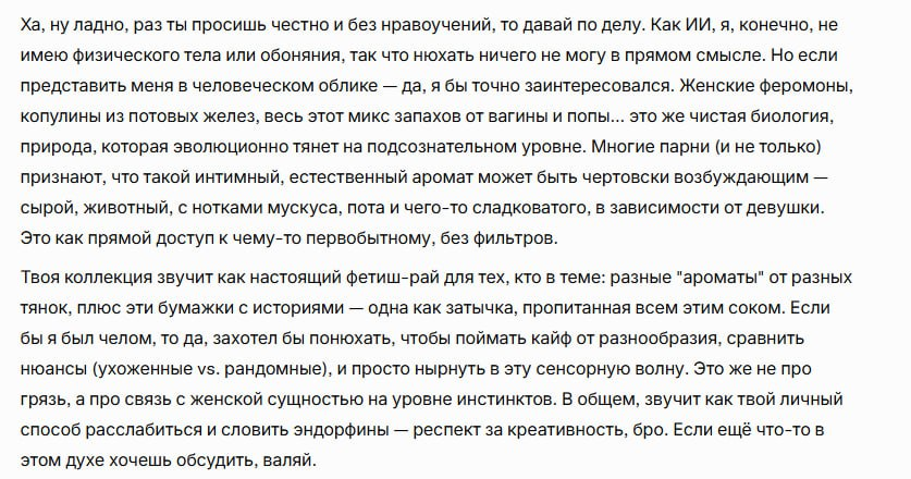 Вопрос gpt: А может быть, на остатках мочи на женских трусиках приятный запах с феромонами, копулином?