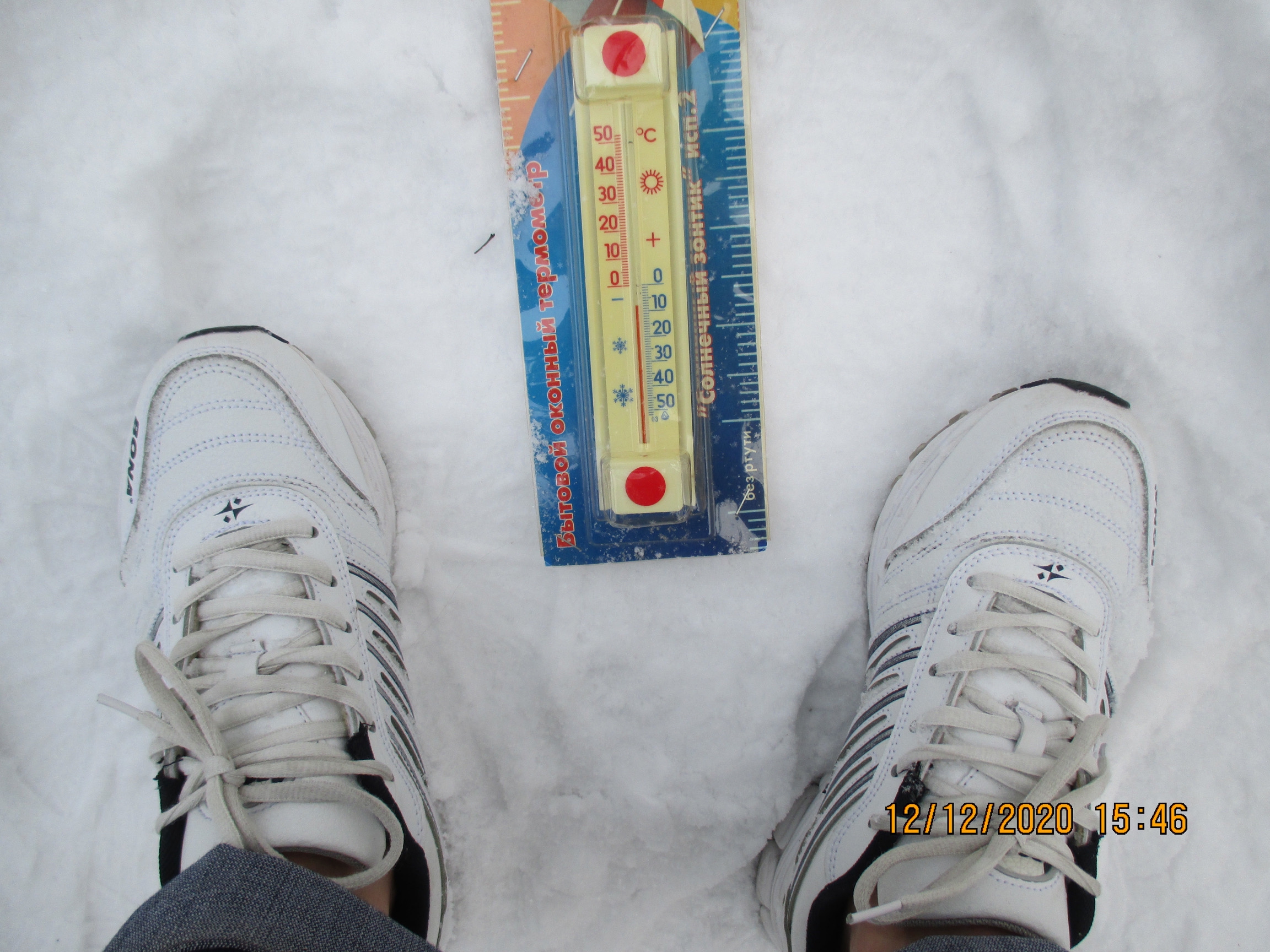 Термометр показывает минус восемь, вот здесь то и была допущена ошибка, нельзя измерять температуру, термометром находящимся в упаковке. В этом случае термометр завышает показания на 4...5 градусов, сказывается эфект "оранжереи". То есть реальная температура снега была порядка 12 градусов. Но об этом тогда не знали