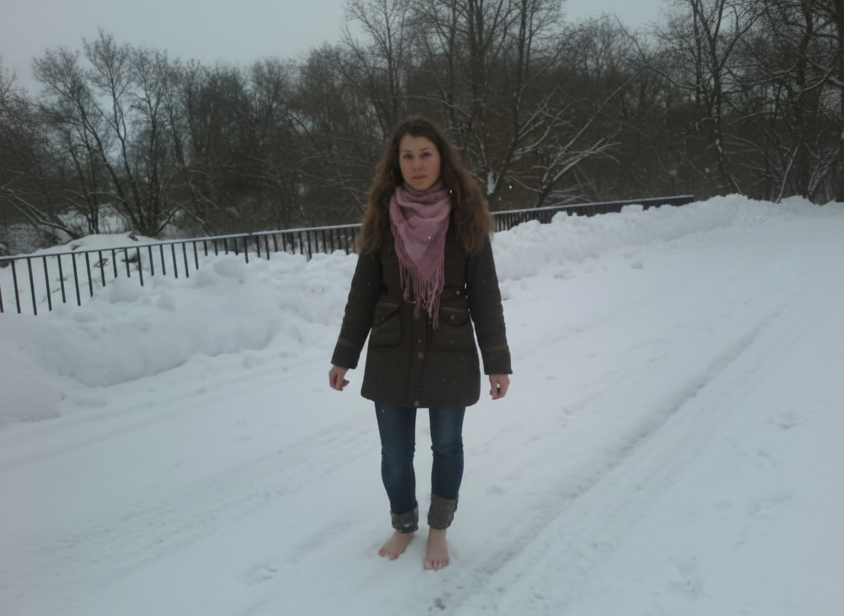 Ощущение было таким острым, что у неё перехватило дыхание. Это не было просто холодом. Это был чистый, концентрированный шок. Тысячи ледяных игл впились одновременно в нежную кожу подошвы. Она ахнула, и пар от её дыхания заклубился в темноте. Больно? Да. Но в этой боли была невероятная, кристальная ясность. Каждая нервная окончание кричала, посылая в мозг вихрь сигналов. Она чувствовала всё: и рыхлую структуру снега под сводом стопы, и мелкие льдинки, и пронизывающий холод, который поднимался по ногам, заставляя мурашки побежать по спине под тёплой курткой и кофтой.