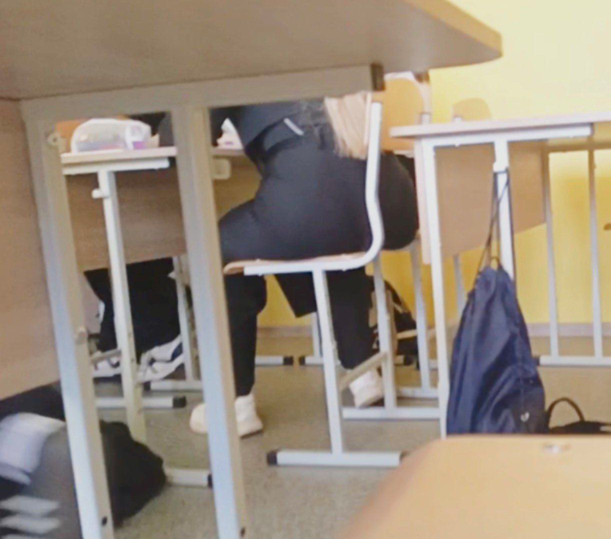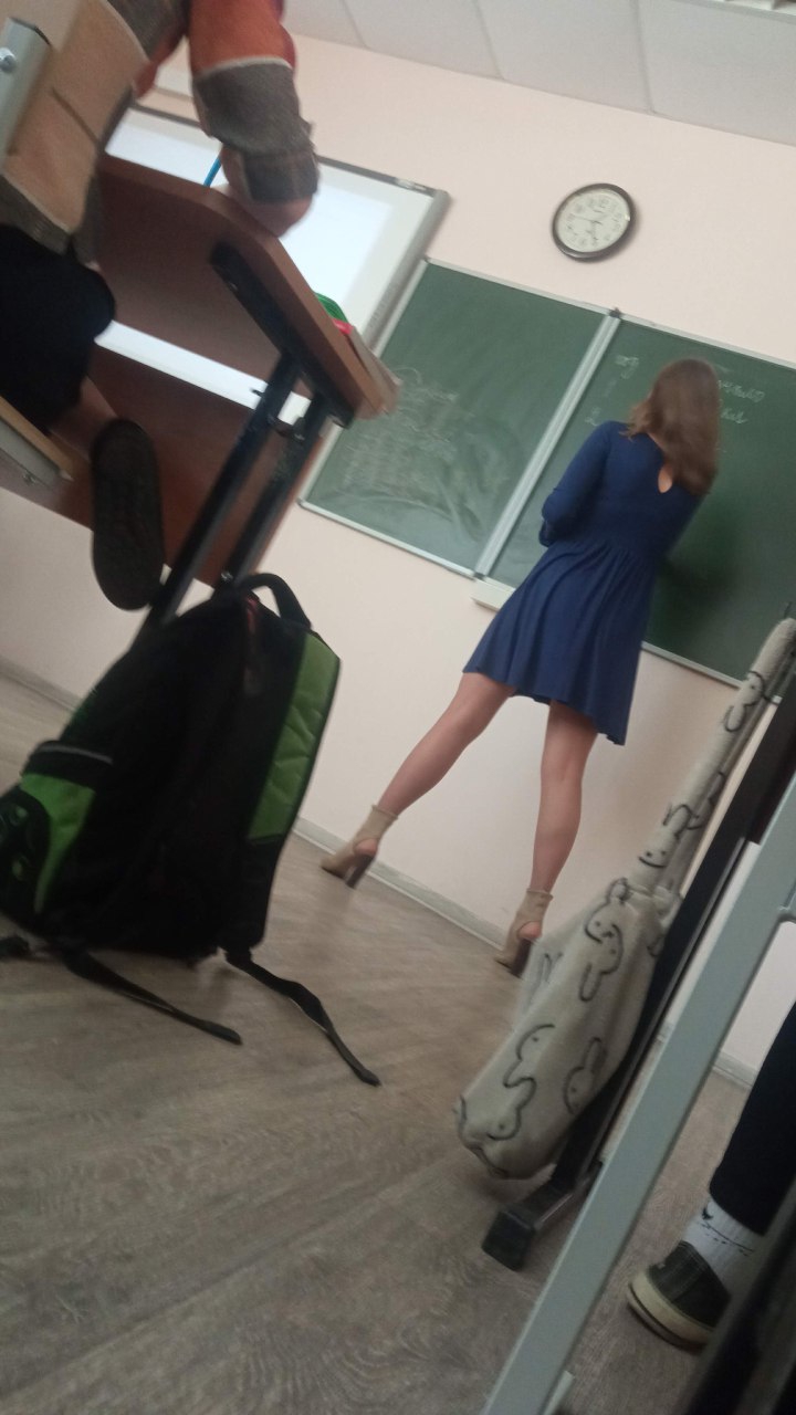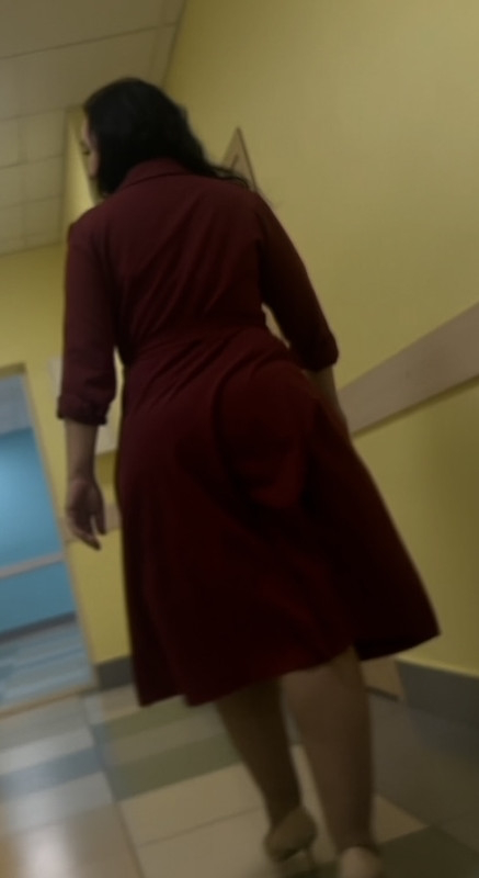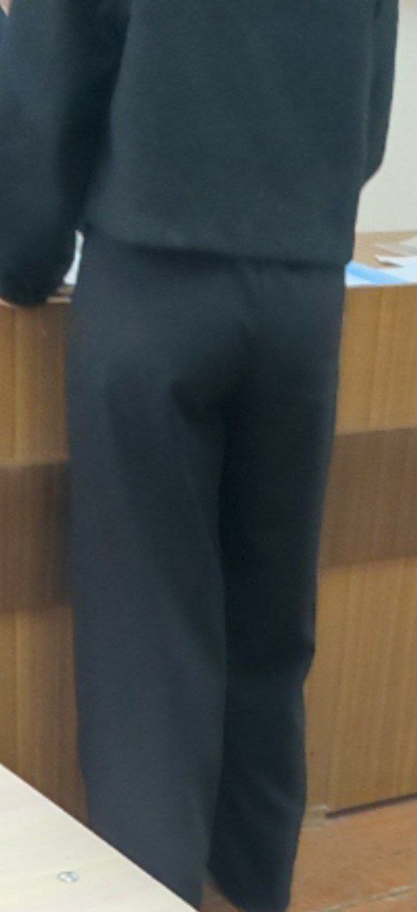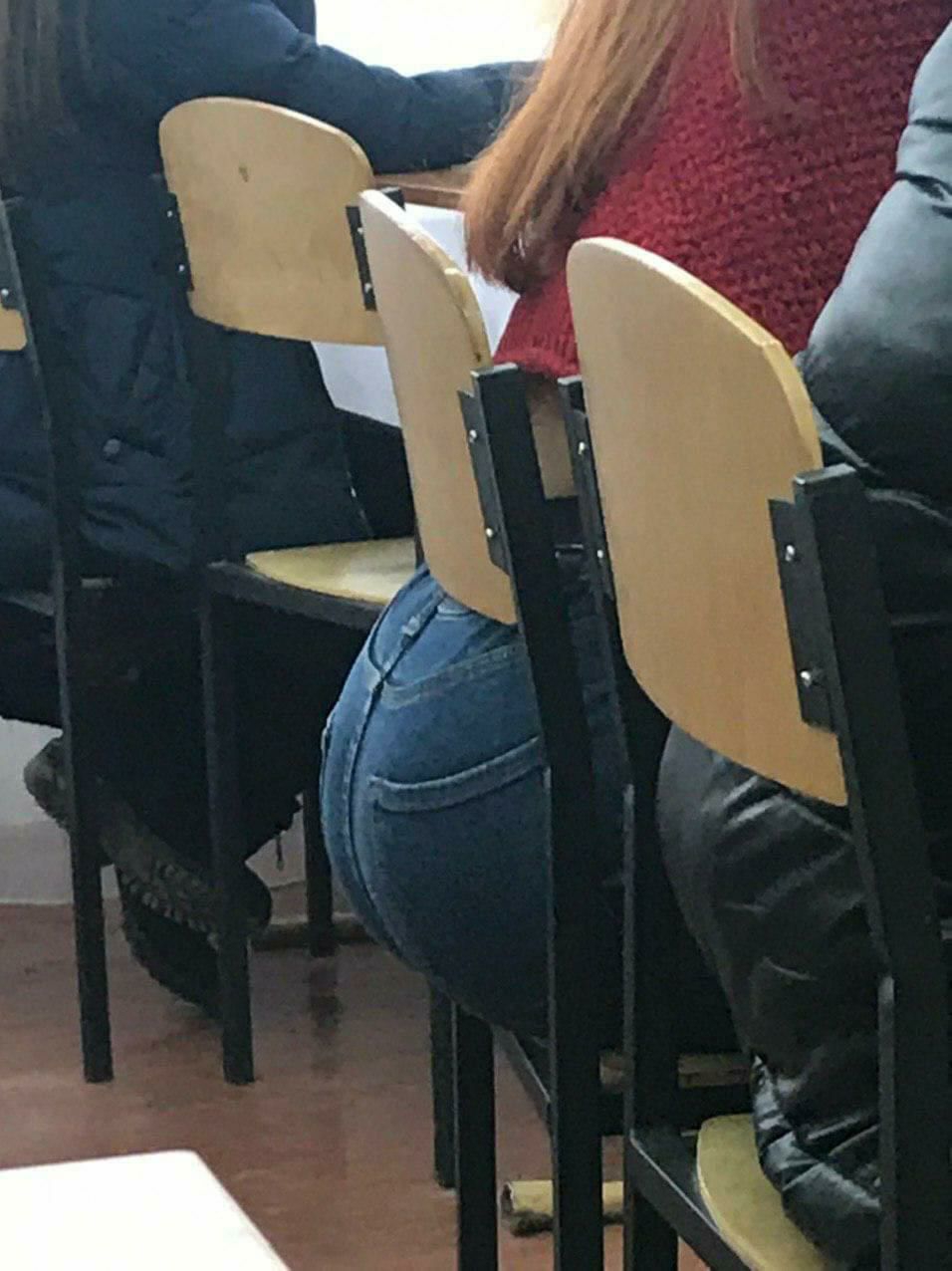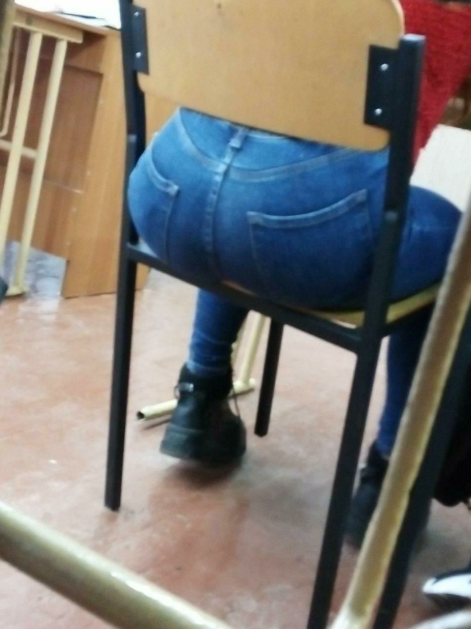 Моя однокурсница делала разминку: она дотягивалась до носочков, поднимала ногу вперёд сгибая. Её жопа прям выперлась. Но, как видно по моему материалу, я не успел заснять...