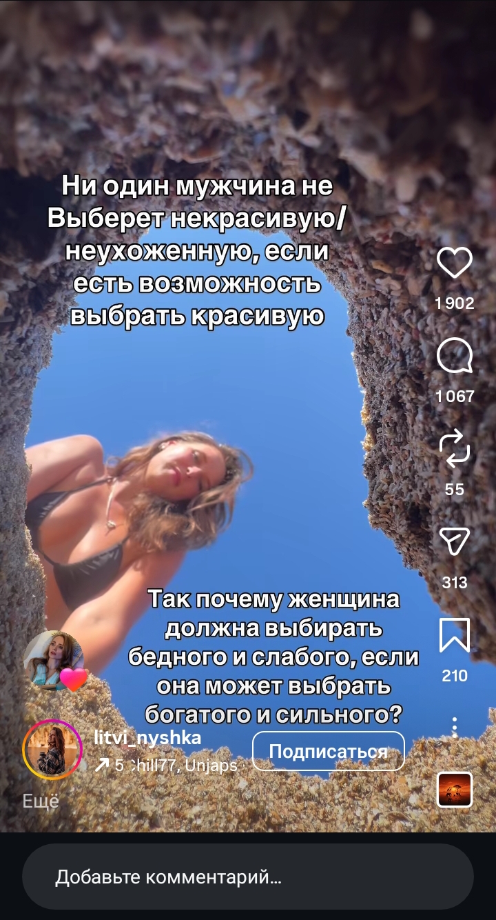 Там наша богиня PlayWithAnny всё же нашла себе шейха. Проверьте последний рилс её. Теперь её прислужницам, которые несколько лет вылизывали её прекрасные ноги за гроши, придется идти работать кассиршами и уборщицами.