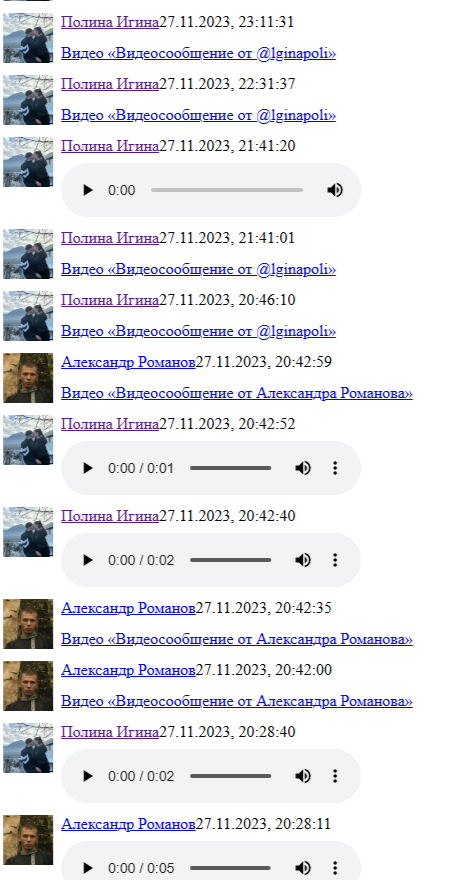 А во-вторых, переписка может выглядеть как-то так. Причём, как уже обсуждалось, далеко не все голосовухи воспроизводятся. А если и воспроизводятся, непонятно как искать годноту. В случае текста я натравливал регулярные выражения, которые искали, допустим, слова "минет", "сперма" и т. д. И потом уже просматривал переписки, которые искомые слова содержали более менее. В случае глосовух можно, конечно, использовать нейронки, но это как-то запарно.