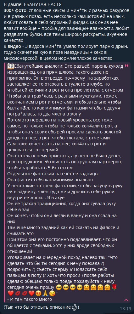Я любитель почитать личные переписки из взломанных аккаунтов, а так же посмотреть на нюдсы, которыми парочки обмениваются. Поэтому я был подписан на несколько тг каналов, которые такие сливы публикуют и собрал достаточно большую их коллекцию. А сейчас решил очистить комп, залить эти переписки куда-то и удалить у себя.