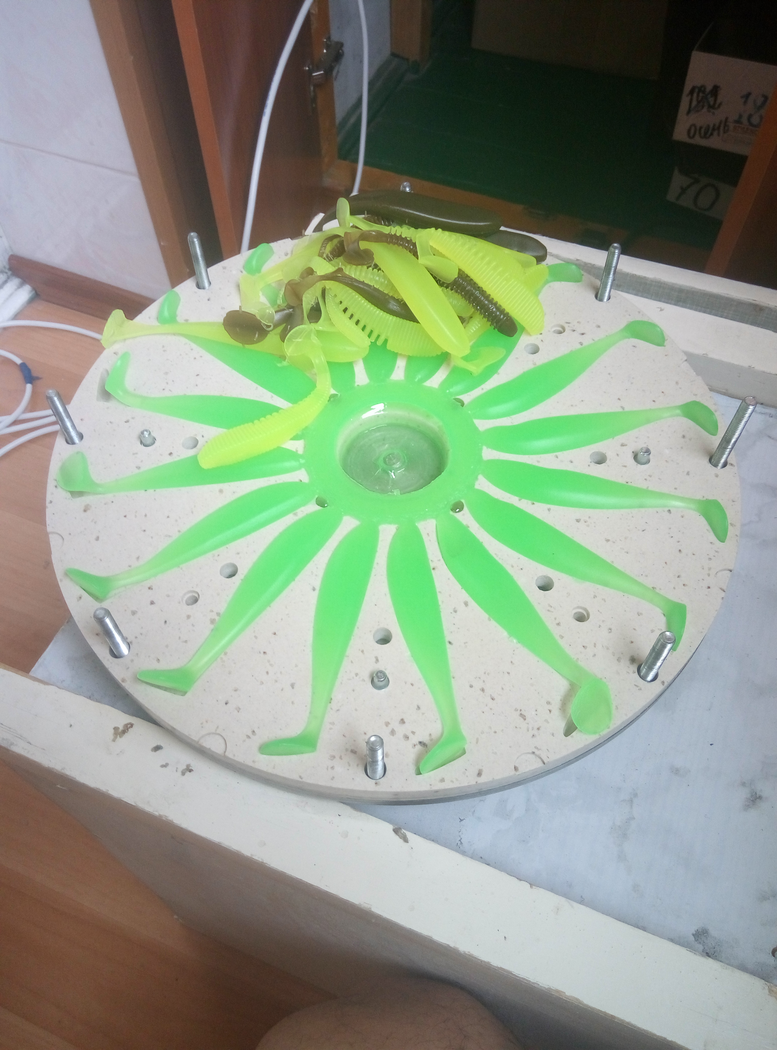 >>20556 Заливается 25-30 гр красного пластизоля и затем сразу же 150 гр белого. Центробежная сила позволяет делать границу между цветами, не смешивая их.