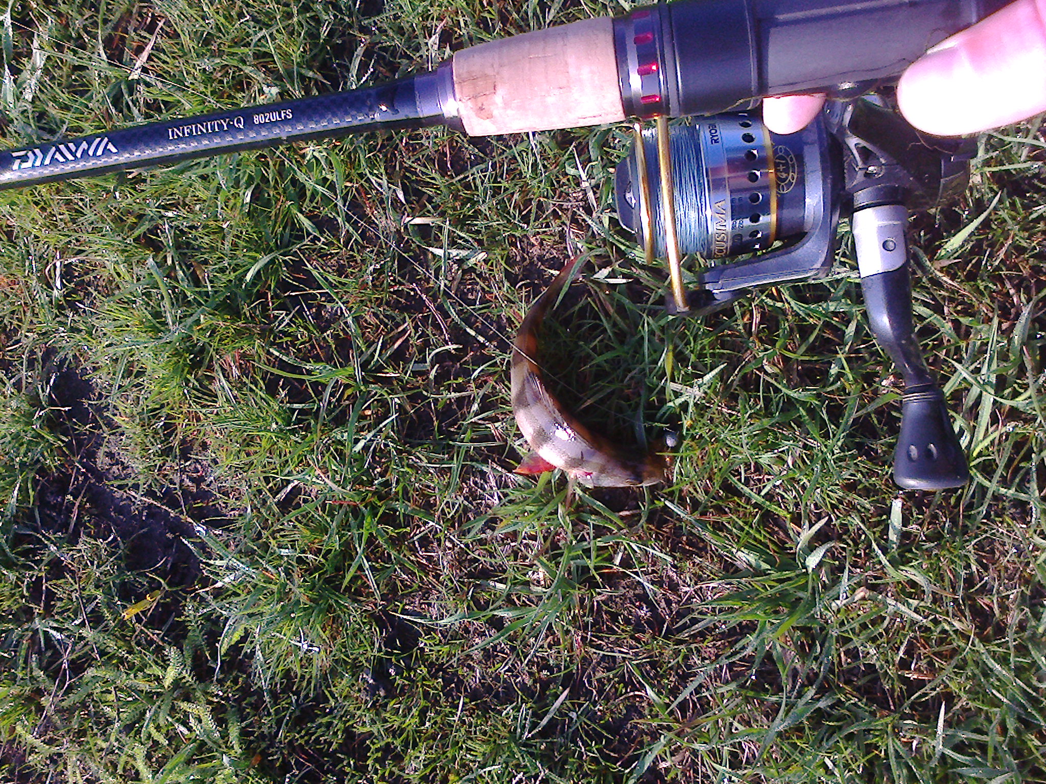 Что то не клюет, покажу вчерашний и сегодняшний трофей, вчера клюнула на нано миннов, цвет машинное масло, а сегодня на рака край фиш помоему, цвет оранжевый, все тот же неудачник-кун
