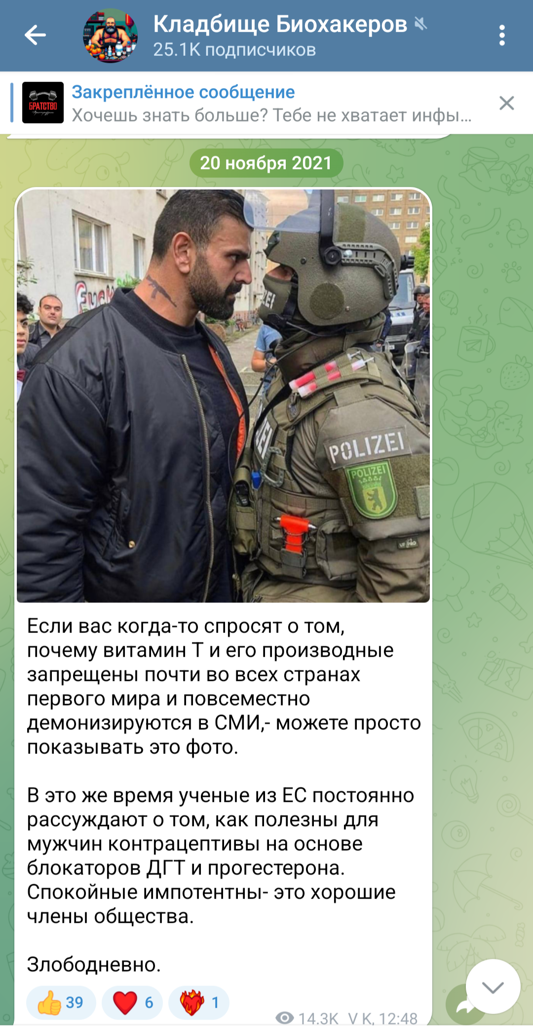 >>2530511 Кстати, по пику: этот дурак не понимает что он пишет! Он пишет "тестостерон запрещен потому, что он делает граждан агрессивными". И он против запрета тестостерона. И? Вы хотите, чтобы по улицам ходили сотни тысяч агрессивных, как дикий буйвол, мужиков? Тогда убийства и тяжкие телесные будут буквально на каждом шагу, улицы будут завалены трупами, биохакеры хуевы.
