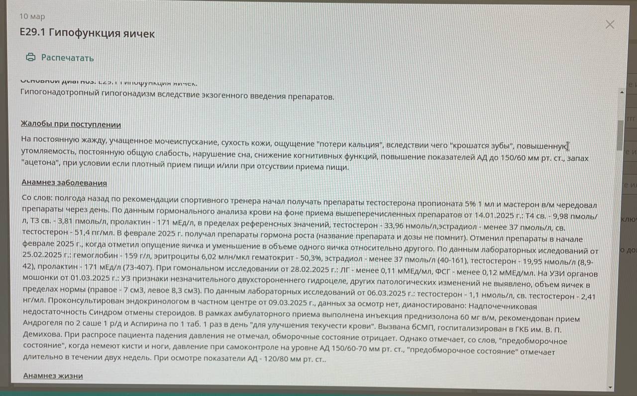* Тестостерон ципионат 60мг каждые 3,5дня (в сумме \~120мг/неделя) → повторный анализ через 6недель → при T >30нмоль/л или эстрадиоле >50пг/мл снизить до 50мг.