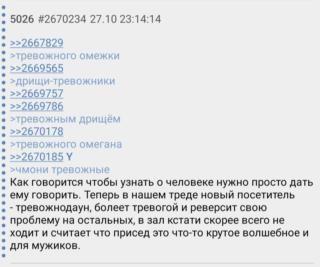 >>2667829 >тревожного омежки >>2669565 >дрищи-тревожники >>2669757 >>2669786 >тревожным дрищём >>2670178 >тревожного омегана >>2670185 >чмони тревожные Как говорится чтобы узнать о человеке нужно просто дать ему говорить. Теперь в нашем треде новый посетитель - тревожнодаун, болеет тревогой и реверсит свою проблему на остальных, в зал кстати скорее всего не ходит и считает что присед это что-то крутое волшебное и для мужиков.