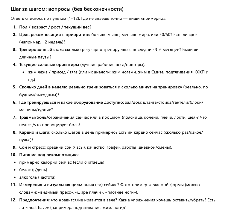 > приседаний нет от слова совсем > дельта пупки > вместо одного нормального жима куча говна это че вообще за треш? мне кажется даже подснежники такое говно не придумают в 2к26, это говно полное чел тебе жпт скамит что бы ты время в никуда потратил