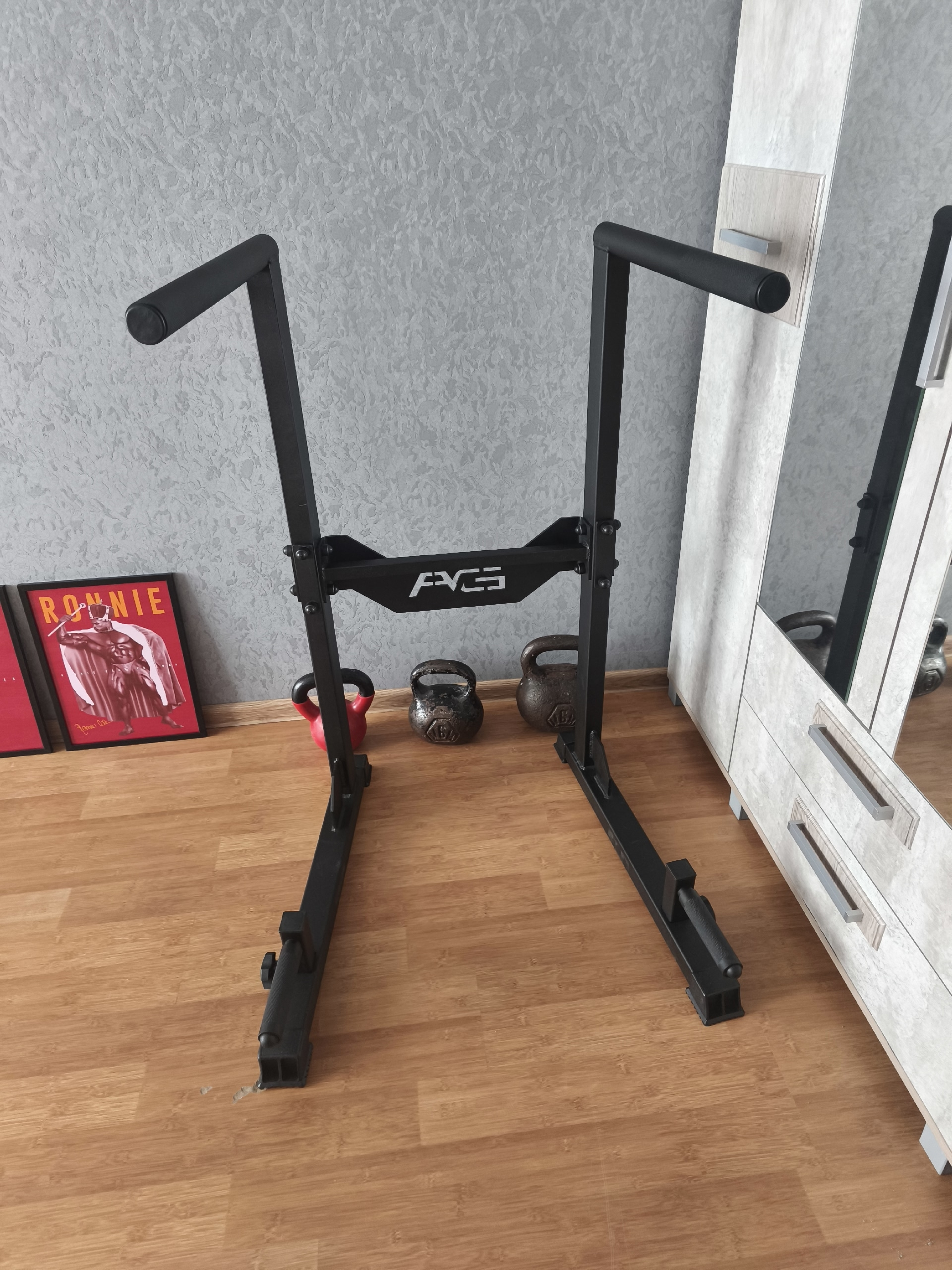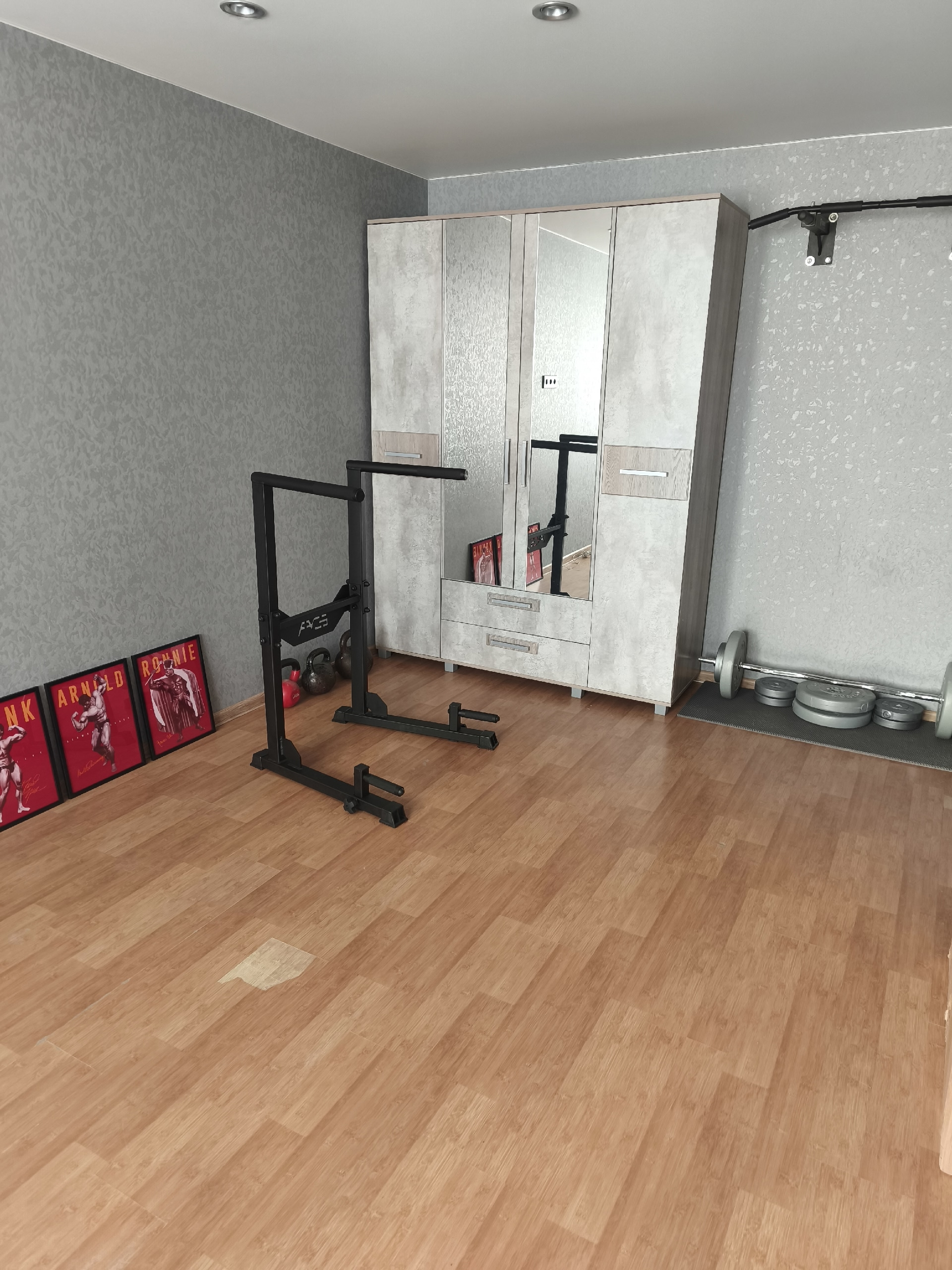 Короче, плакаты в помойку (на авито), шква отдаешь даром. Вместо шкафа ставишь брусья, а по стене где плакаты ставишь стойку для приседа, обкладываешь резиновыми ковриками и собираешь нормальную штангу, кг на 120 хотя бы.