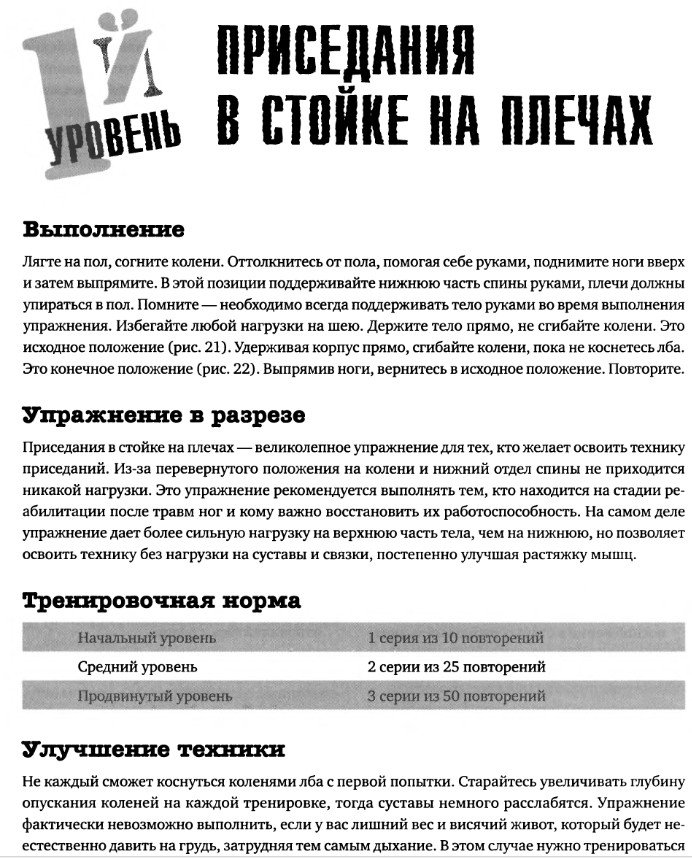 Приседания: - Драконьи. Начал после приседаний на одной 2-20. Требуют техники, сначала делал уровень с опорой на землю рукой в конце, потом чистые. Прогрессия в книге хорошая
