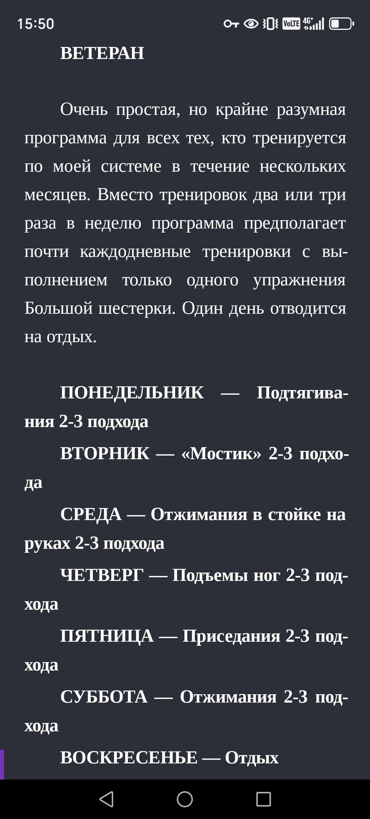 >пик Высказываю сугубо личное мнение на основе собственного опыта. Мостик и прочие уровни исключить. Вместо него делать махи или становую с гирями. Подъемы ног можно делать, но я бы сделал акцент на упражнения на кор с гирей. Отжимания в стойке я бы исключил, заменив их отжиманиями с добивкой жимом гири. Шестой день я бы посвятил тренировке малых мышц - хват, икры, шея. Или отдыхал.
