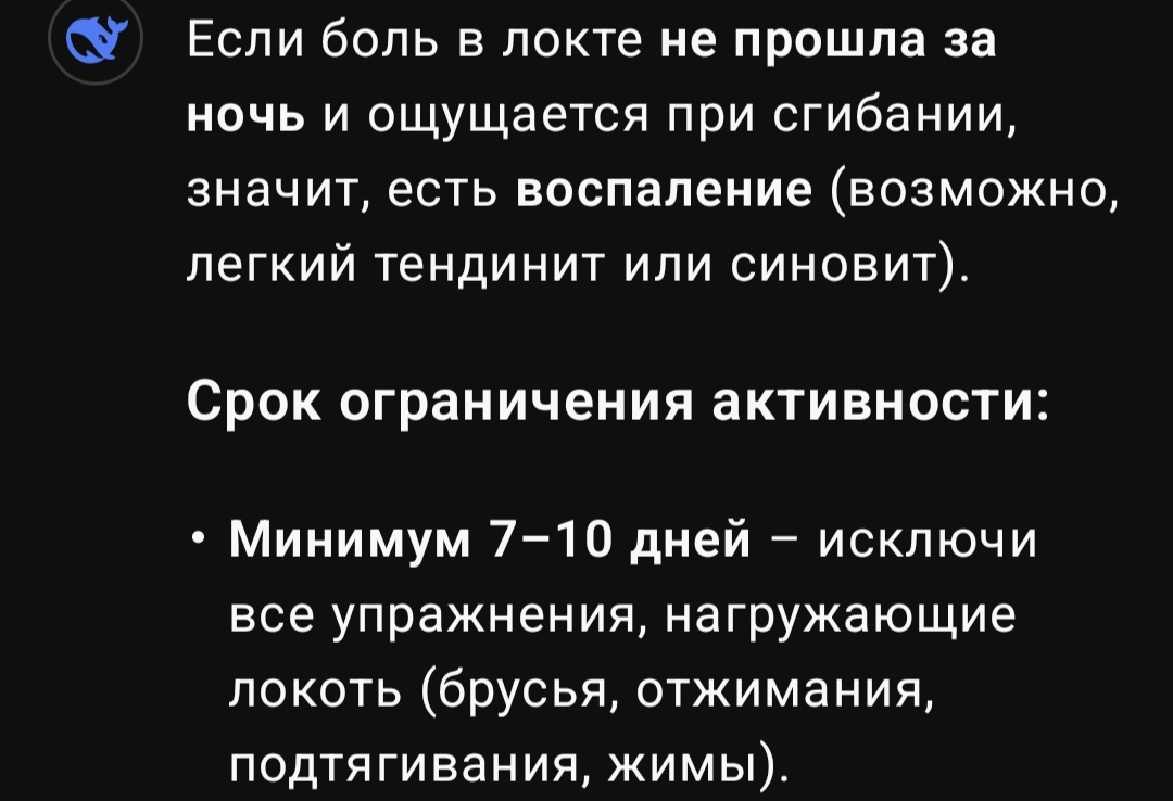 >>2624885 Брусья это же обычная школьная программа - сделал несколько подходов и свободен. А ты умудрился сломать себе локоть насмотревшись какого-то протыка на ютубе.