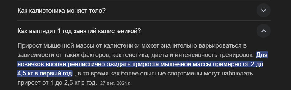 >>2620899 >>2620921 Я еще хотел сказать, что СС далека от совершенства. По ней надо позаниматься, чтобы понять, что она очень ограниченна в плане результативности. Для вката - норм. Но потом надо менять, варьировать, увеличивать. Короче - искать свое. Ты тоже поделай, попробуй, найдешь свое. Единственное, что надо быть последовательным в тренировке и действовать по принципу "лучше меньше, да лучше". Советую канал k-boges. Начни у него с самых популярных видосов, а потом просто посматривай время от времени все, что он говорит.
