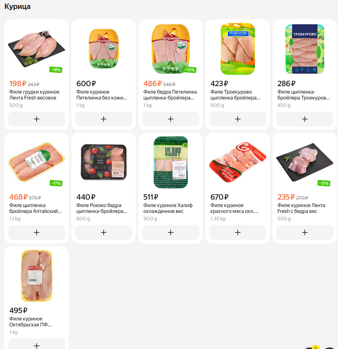 >>2633198 У меня в супермаркете самые дешевые яйца стоят 65р и они все в кале и часть битые. Творог 200-220р за 500г. Куриное филе от местных производителей самое дешевое 406 рублей за 1кг, но оно резиновое по вкусу. Овсянка 70р за 800г, гречка 87-90р за 800г. Сметана 107р за 400г, кефир 90-124р за 950мл