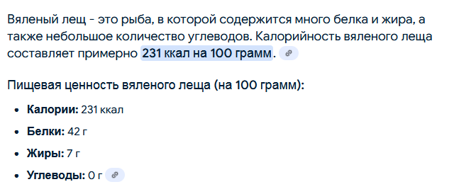 >>2633625 >Ну так посыл в том, что за 300р ты ничего не купишь. Там минимум 400-460 за кг. Если 1 кг делить на 6 порций, то это 66р из расчета 400р за кг Вяленый лещ стока же стоит, 400-500, может и дешевле можна найти.