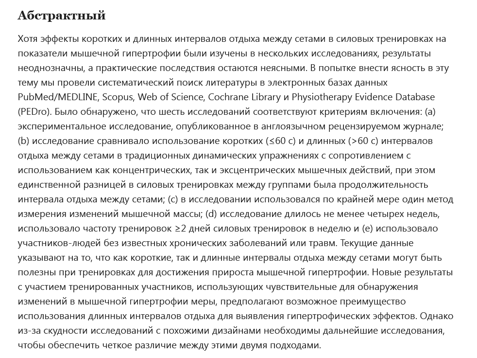 >Ну нет, отдых между подходами в целом хуйня, позволяющая низкоорганизованным людям вообще ничего не делать в зале. Твоя цель не поднимать веса, не делать рекорды, а угандошить мышцы. Цель - это гипертрофия мышц, а не то что ты там в голове выдумал. >Мышцы намного лучше угандошиваются с малым отдыхом. 3 минуты отдых это абсолютный проеб времени и потенциала Бросаенс as is. Длинные интервалы могу быть эффективнее для гипертрофии. >Вообще не обязательно. 1.5 г на кило абсолютного веса у обычного парня должны вылиться в 25кг мышечной массы нарощенной за год. Но не выливаются же. На деле 1г на кило абсолютного веса, 1.2 на сухой - более чем достаточно. Это ты так прочувствовал. Метаанализ 49 работ показывает что 1.6 г. белка дают эффект на гипертрофию.