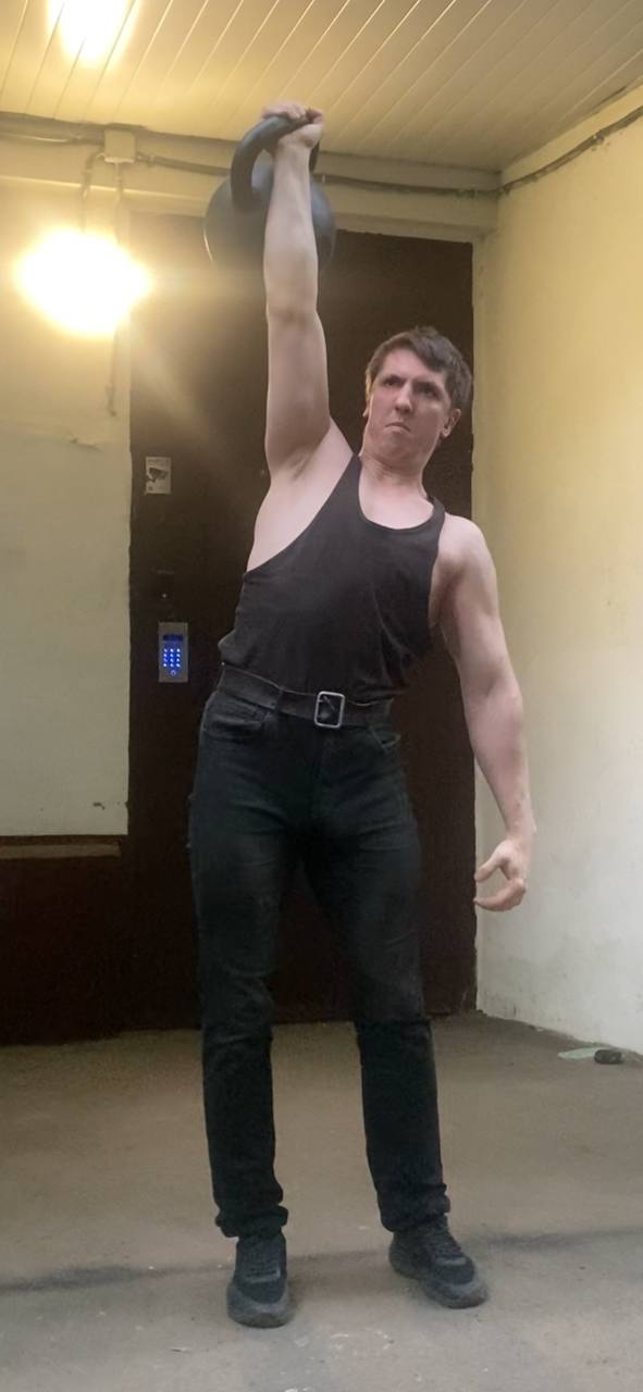 Почти получается сделать швунг зрелости, но пока не научился держать две гирьки крепко в руке, из-за страха что гиря на большом палце упадёт не могу выложиться на полную.