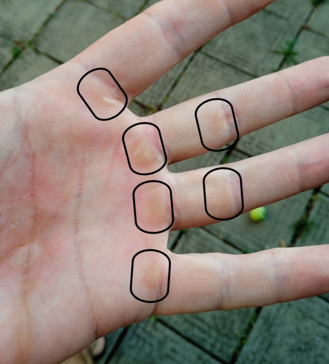 >>2630851 У меня мозоли вот так расположены, а там, где ты обвёл, мозолей нет совсем. С ладони живая кожа оторвалась, не мозоль. Мозоли целы все, потому что не сбрасывал на пальцы. >Чтобы техника не уходила делай меньше рывков и больше походов. Просто захотелось максимум узнать.