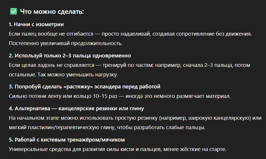 Купил 2 набора эспандеров: первый 3-5 кг, второй 1-5 кг. С самым лёгким первым у меня не отгибался большой палец левой руки, на правой всё норм. Со вторым самым лёгким не разгибался даже на правой.