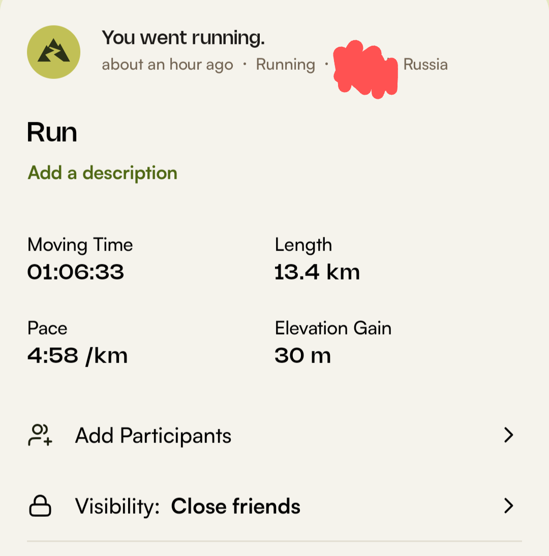Конечно разница между бегом на стадионе по резине и по говнам по полю за городом заметная, ноги заметно устали от того что постоянно нужно ловить землю под разным углом. На стадионе 2х от этой дистанции выбегается проще и ноги потом не ноют, видимо индикатор того что у меня ноги в не настолько окей состоянии как думал.