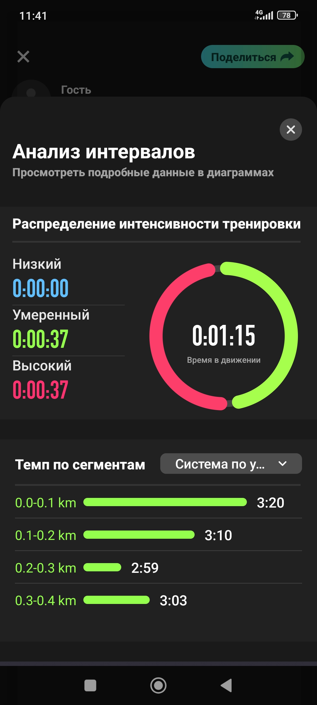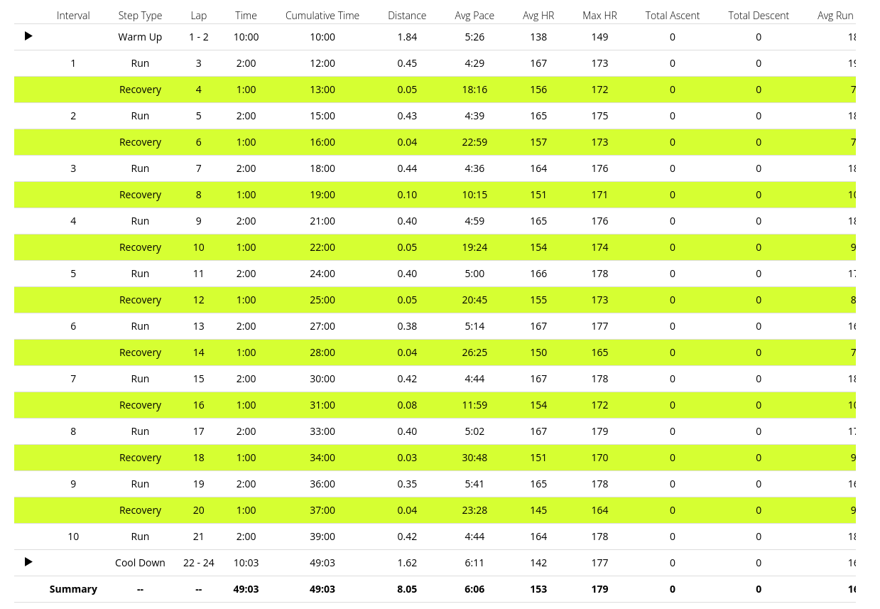 Часы определяли темп и дистанцию с выключенным GPS, поэтому точность ниже. Если для бега ещё темп более-менее точный (но всё равно на 30-40 секунд выше, чем обычно для таких интервалов), то для ходьбы между интервалами часы безбожно врут - показывают темп ходьбы раза в 2 больше, чем обычно. Возможно, из-за того, что данных по бегу намного больше, чем данных по ходьбе.