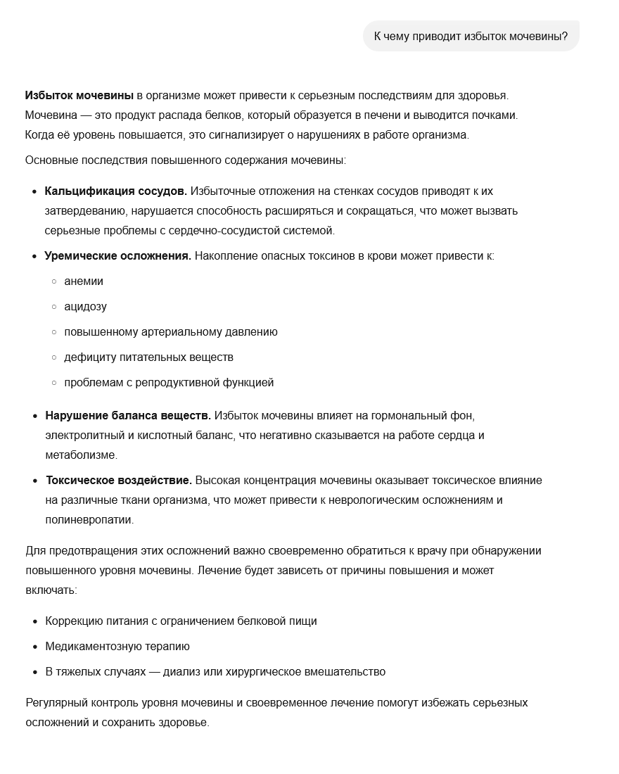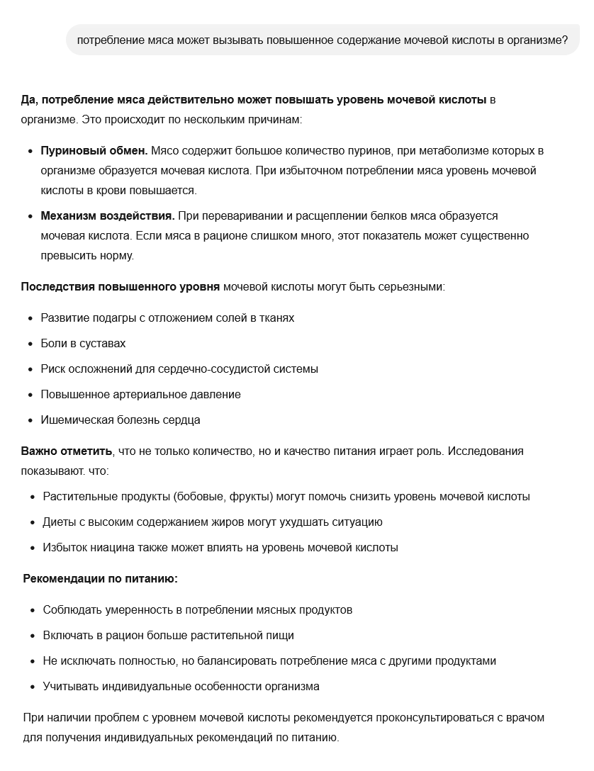 >>2677254 >Т.к. настоящие факты говорят о том, что длительное употребление 4г белка на кг веса здоровыми людьми не несёт вообще никаких негативных последствий Последствия будут, просто у здоровых организм покрепче и дольше будет сопротивляться. Но это всё равно его изнашивает. >Именно галлюцинации, таков принцип работы вероятностной базы данных, к которой ты обращался. Как мочевая кислота и мочевина образуются давно известно и последствия их повышенного уровня в организме.