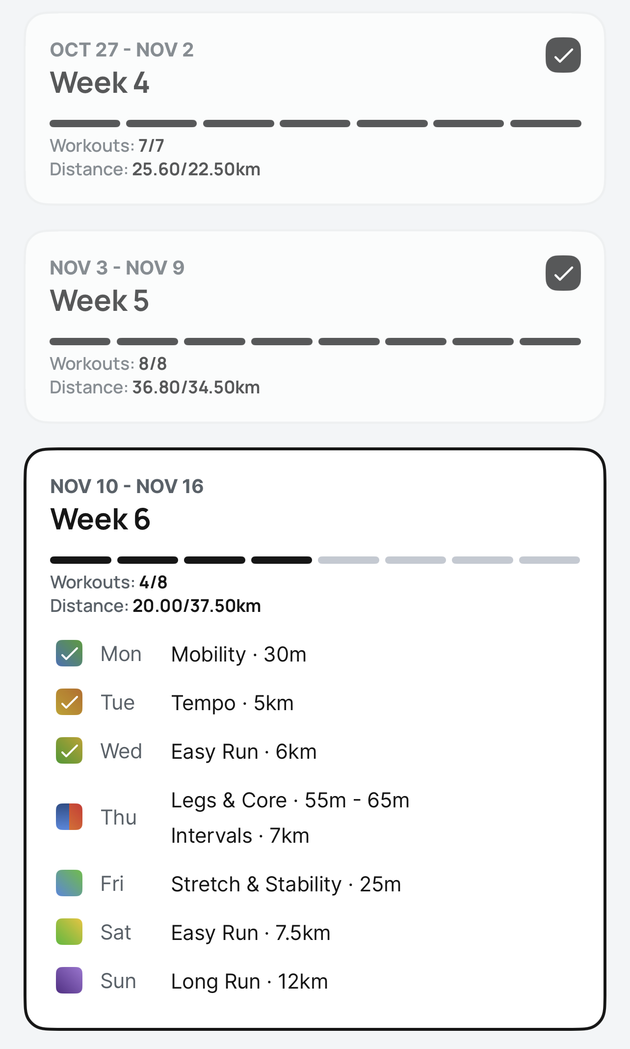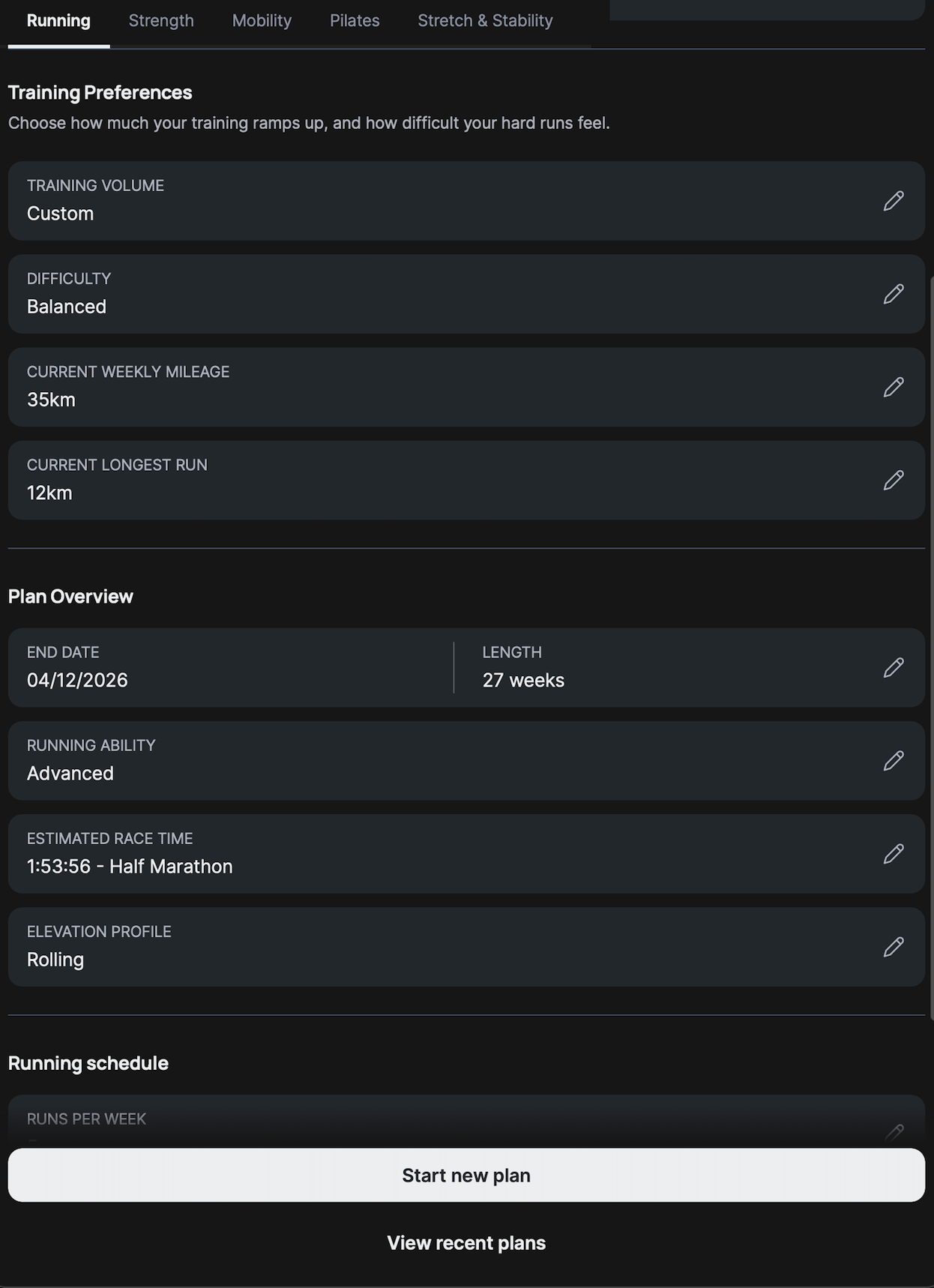 Итак, Runna. Ща 6я неделя плана из 27ми на полумарафон. Помимо бега заказал 2 растяжки и 1 силовую (кста, видосы с йогой и растяжкой лежат на их ютуб канале в открытом доступе). Мне оч нравится. Если сравнивать с garmin coach то тут тотальное разнообразие тренировок и детальные настройки плана. Тупо веселее. Есть небольшой пояснительный текст для каждой тренировки, да, там описываются банальные вещи, но это оч помогает. Есть ai саммари посте трени, это скорее полезно чем нет.