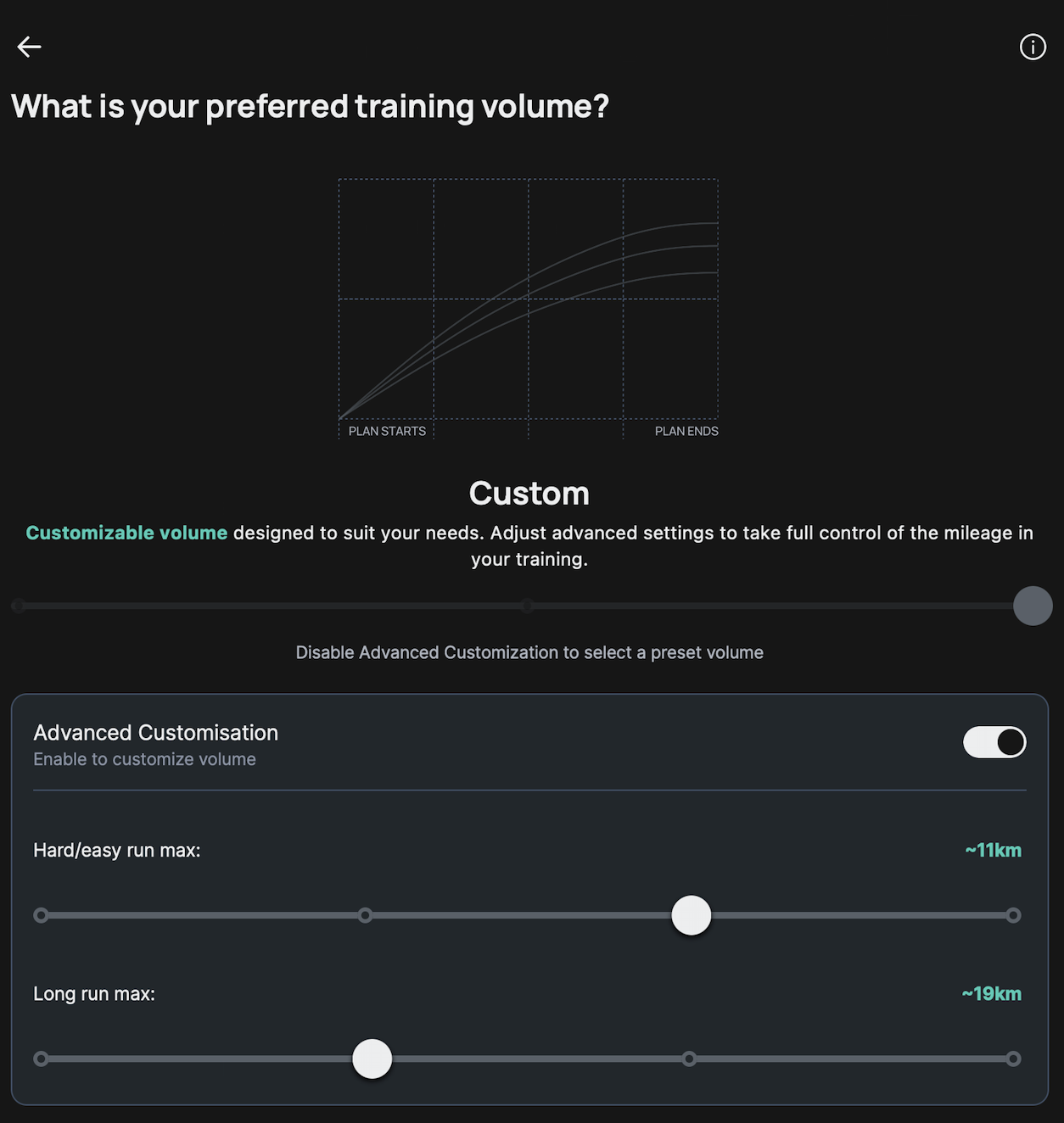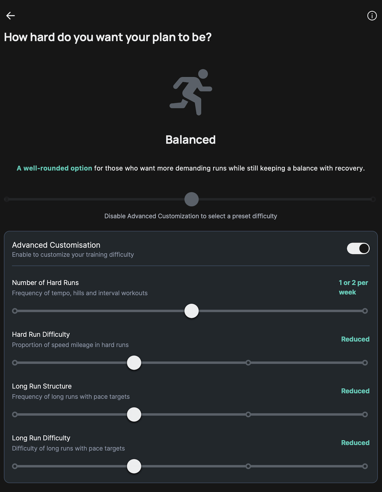 >>2675830 Тут нет никакого интеллекта. Всё вычисляется и перестраивается через гибкие настройки плана. Если тебе тяжело/легко просто измени настройки. Естимейты на дистанции он вычислит. В начале указываешь сколько у тя PB на какойнить дистанции, сколько объём был в последние недели и какой лонг. Дальше куча настроек объёмов и сложности.