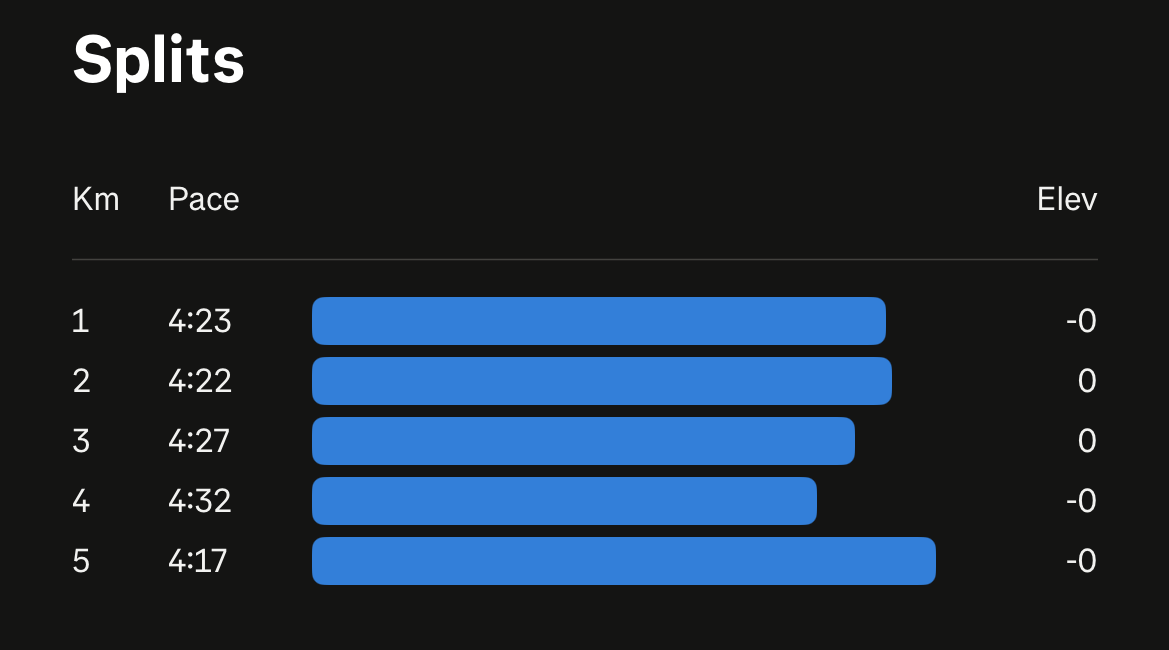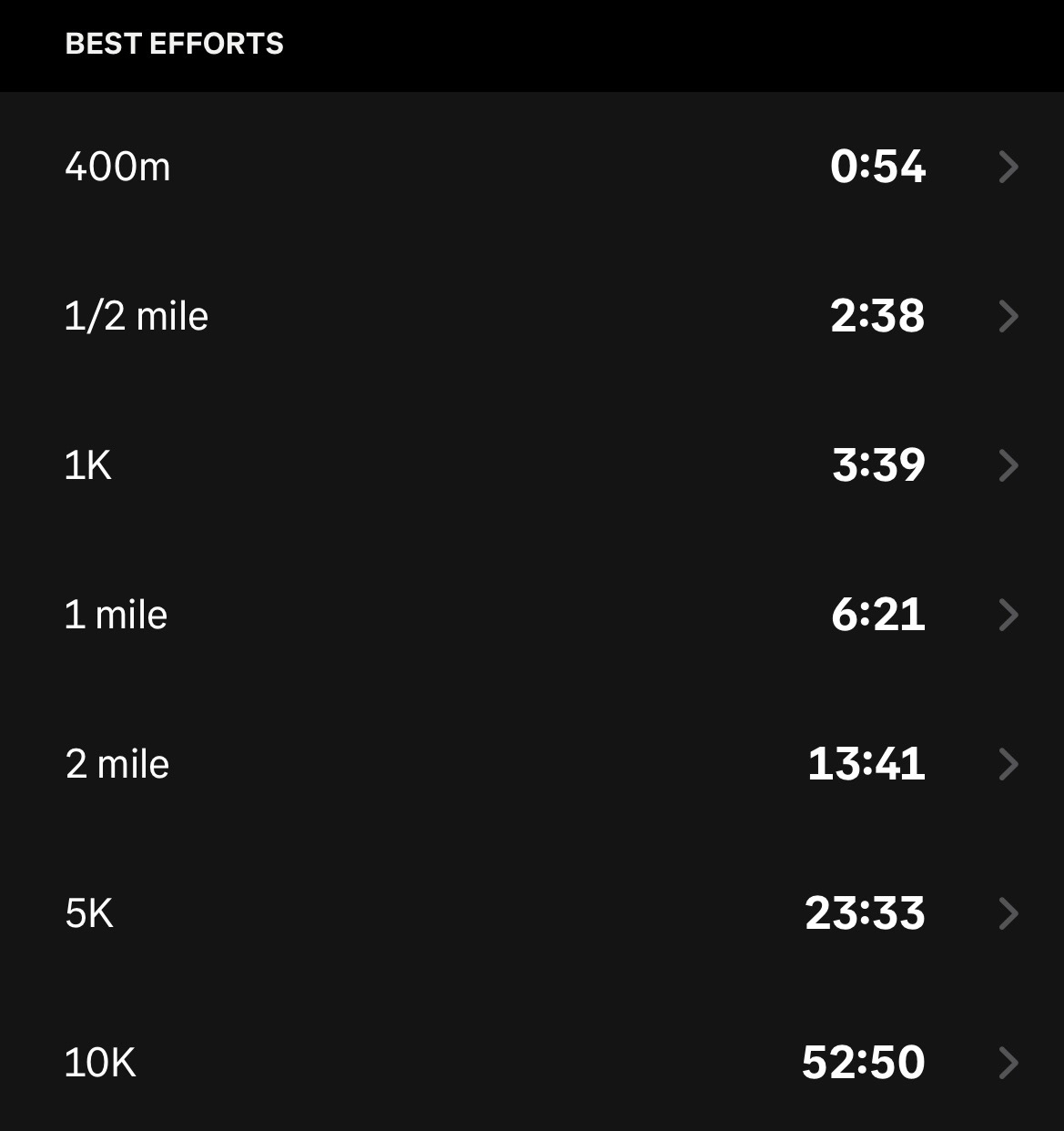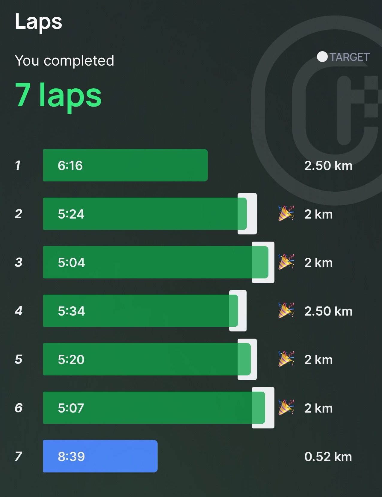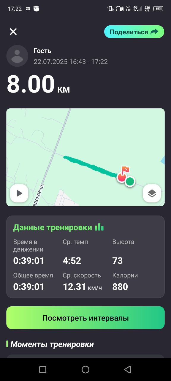 ~10 месяцев бега с нуля, курил до этого больше 10 лет, вот восстанавливаю теперь лёгкие и здоровье. Нарочно не выдавливал из себя максимальную скорость, но наверное стоит, чисто чтобы увидеть на что способен. А вообще смотрю и как-то грустно выглядят эти "рекорды", мне кажется за почти год можно было достичь значительно больше.