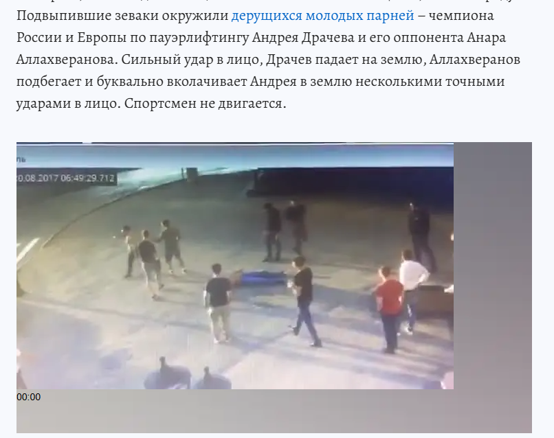 >>2709170 Очнись маня. Притом что Драчев был завязан в драку и ожидал ударов, а если тебе неожиданно в ебло боксер пропишет, так же в новостные сводки попадешь
