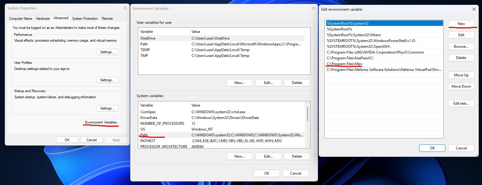 >>754041 >>754048 Тебе нужно было mpv-x86_64 качать. Распаковать все в удобном месте(у меня в program files). Там в папке должен быть updater.bat, запускаешь его от администратора и он сам докачает необходимое(ffmpeg+ytdlp). ffmpeg - это конвертер видео, аудио и изображений. ytdlp - это софтина чтобы с ютуба и других сервисов видосы скачивать. Еще желательно всю эту папку добавить в environment variable, чтобы ты имел к этим программам доступ из любого места на пк, вот как на пике. Для перемотки по сабам и их автокопирования в буфер используй этот скрипт https://github.com/Ajatt-Tools/mpvacious